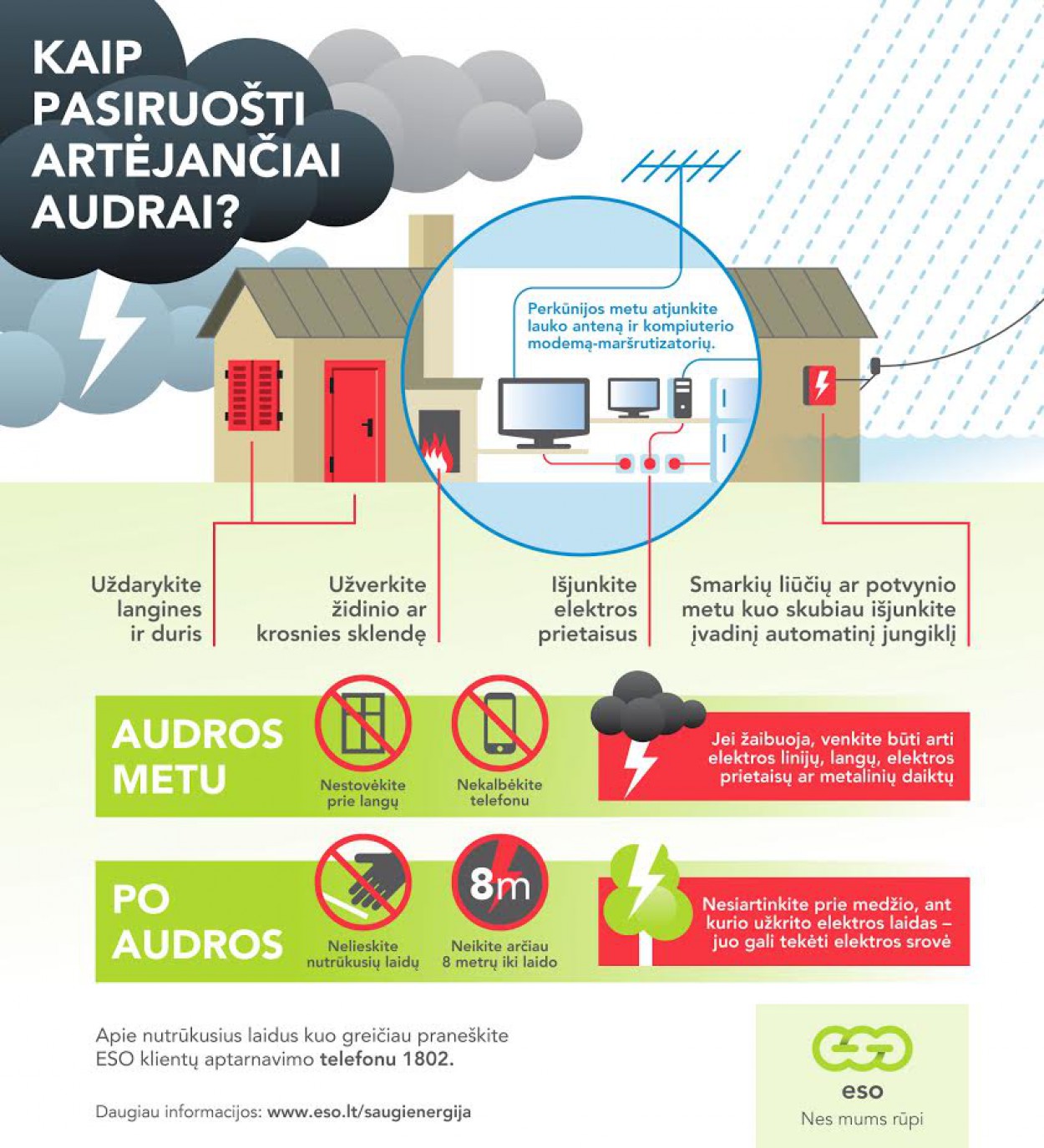 ESO primena, jog pastebėjus pažeistus elektros tinklo įrenginius ar nutrūkusius elektros laidus, būtina nedelsiant apie tai pranešti ESO trumpuoju numeriu 1802 (+37061121802) arba bendruoju pagalbos telefonu 112. Pateikiame keturis svarbiausius elgesio principus, padėsiančius išvengti skaudžių nelaimių.