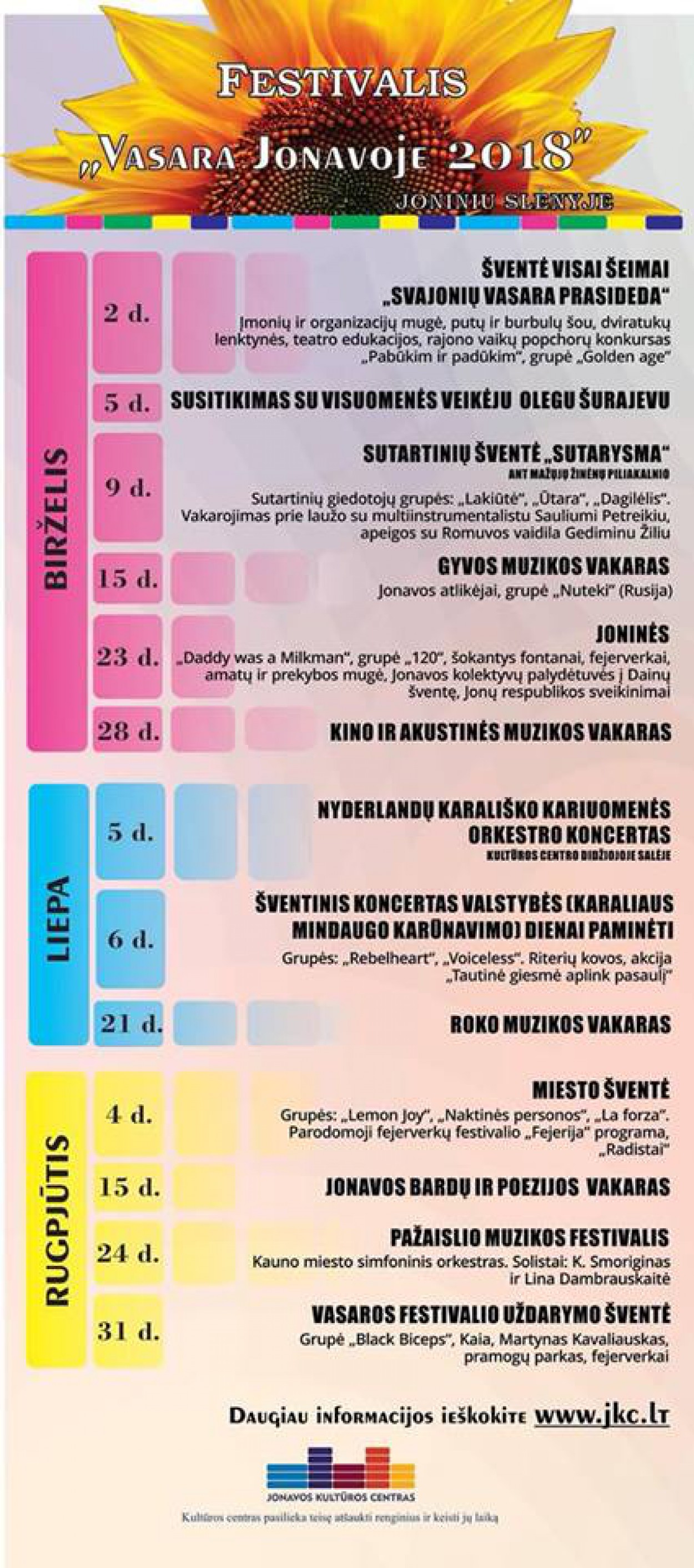 Kaip „Jonavos žinioms“ sakė Jonavos kultūros centro (JKC) direktorius Sergejus Jefimenka, vasaros festivalis tiks visiems - tiek jauniems, tiek vyresniems žiūrovams. Netrukus startuosiantis festivalis „Vasara Jonavoje 2018“ atneš daug džiaugsmo jonaviečiams ir miesto svečiams.