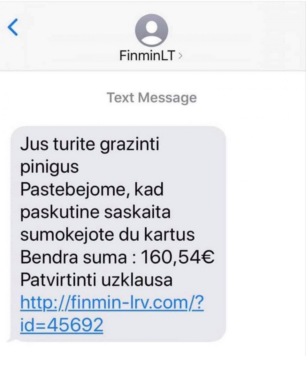 Finansų ministerija įspėja, kad šiuo metu plinta tikrovės neatitinkanti informacija („fake news“), kurioje asmenys gavę SMS žinutę iš adresato, pasivadinusio „FinMinLT“, raginami paspausti el. nuorodą ir susigrąžinti permoką.