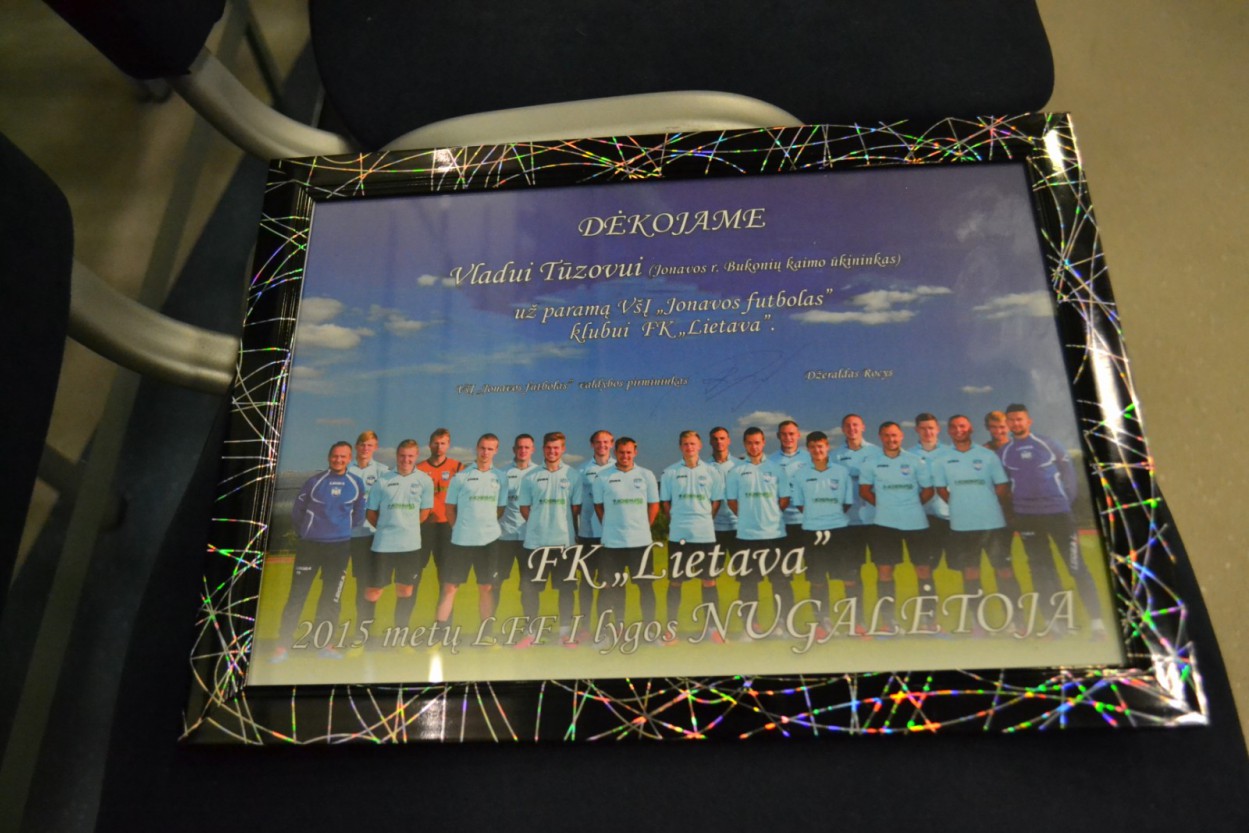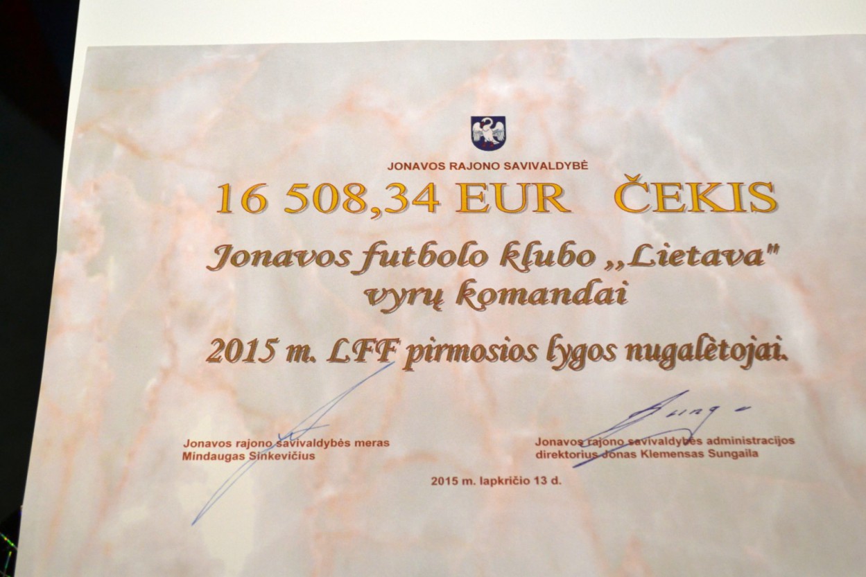 Šie mero žodžiai skambėjo savivaldybės Jeronimo Ralio salėje, kurioje vyko „Padėkos“ vakaras, skirtas pagerbti 2015 metų Lietuvos futbolo federacijos (LFF) pirmosios lygos nugalėtojus. Šiemet jais tapo Jonavos „Lietava“ futbolo klubas, kuris sportiniu principu iškovojo teisę jau kitais metais varžytis aukščiausioje lygoje. Komandos rankose ir savivaldybės skirta premija už pirmąją vietą - 16 tūkst. 508 eurų ir 34 centų čekis.