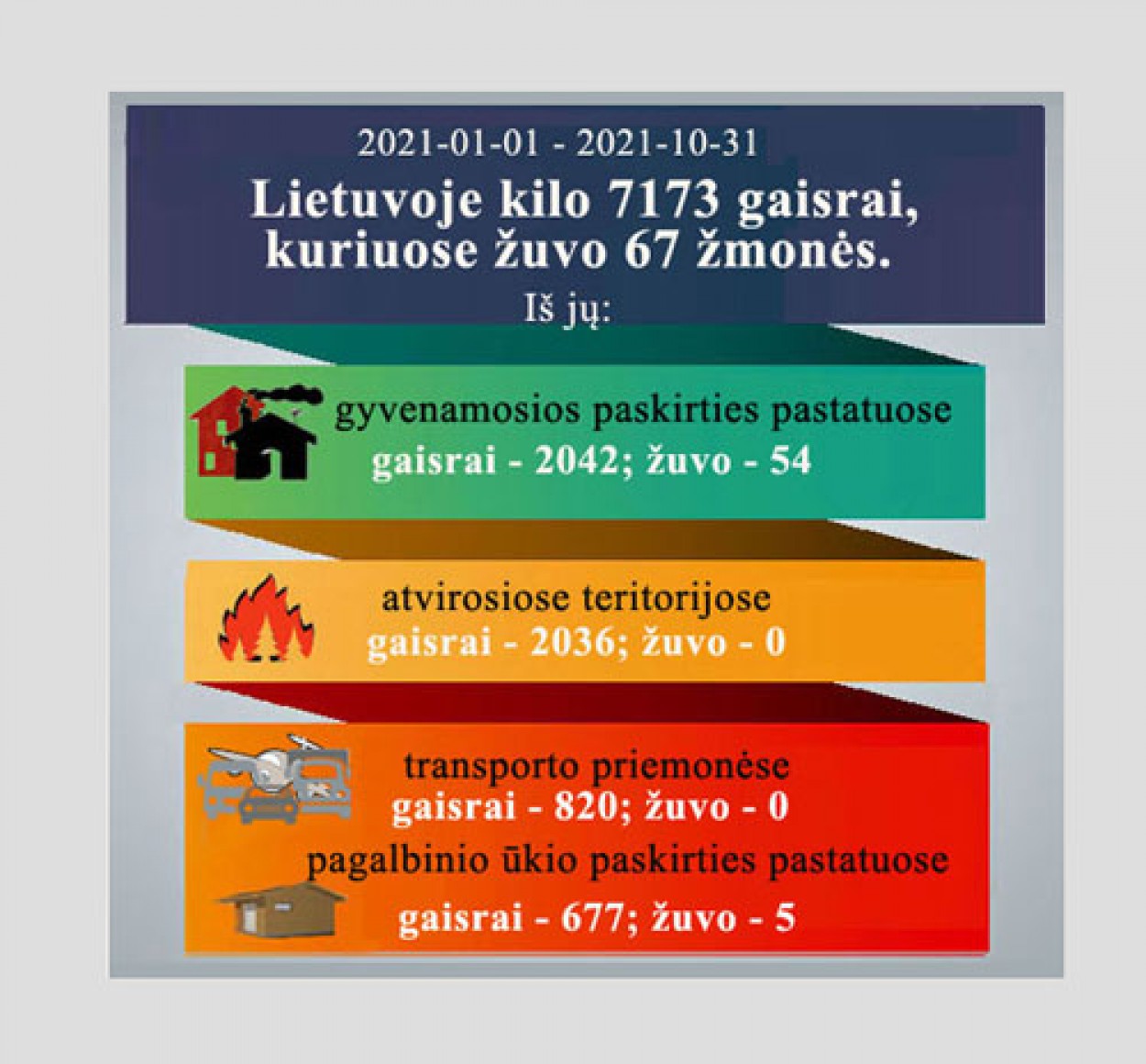 Priešgaisrinės apsaugos ir gelbėjimo departamento duomenimis, per dešimt šių metų mėnesių Lietuvoje kilo 7173 gaisrai. Palyginti su praėjusių metų tuo pačiu laikotarpiu, jų buvo 6,3 proc. mažiau. Pernai kilo 7654 gaisrai. Tai mažiausias 10 mėnesių gaisrų skaičius per 18 metų. Per 10 šių metų mėnesių gaisruose žuvo 67 žmonės, iš jų 3 vaikai (pernai per tą patį laikotarpį – 73 žmonės, iš jų 2 vaikai), o 146 gyventojai (120) patyrė traumų.