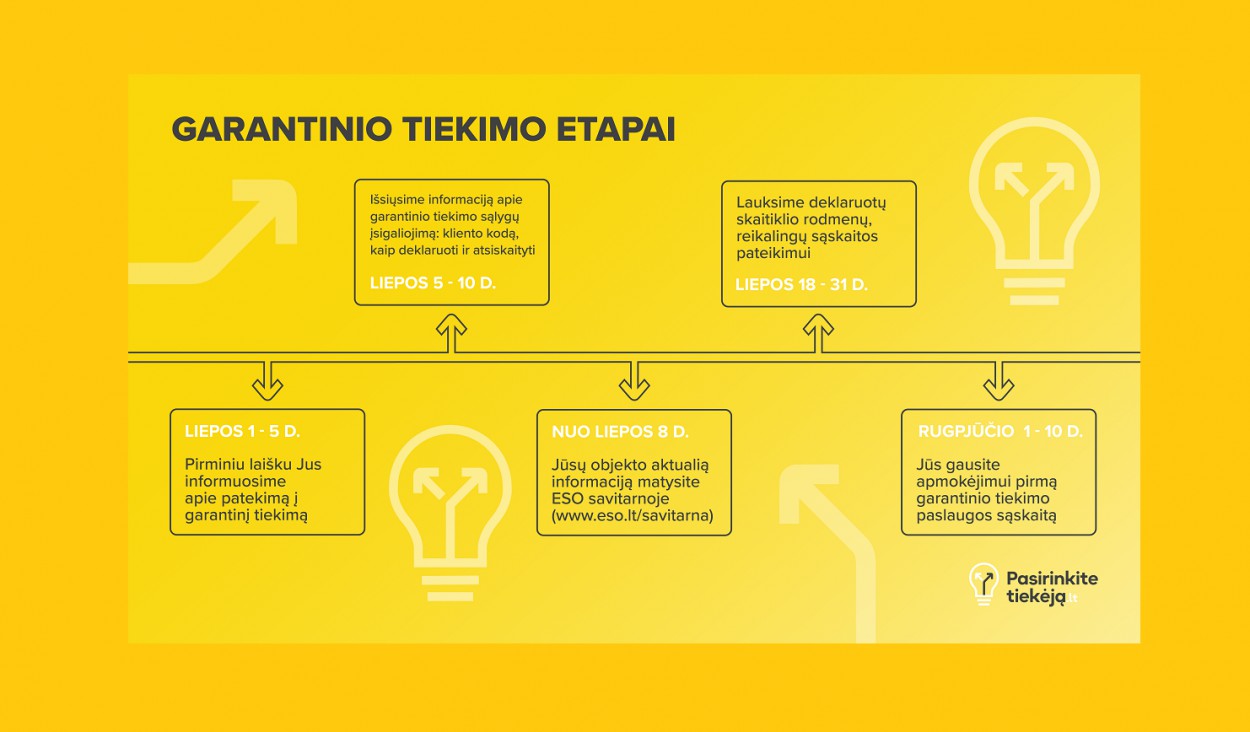 Daugiau informacijos rasite ESO svetainėje eso.lt, skiltyje „Garantinis tiekimas“ arba paskambinę telefonu 1852. Išsami informacija apie elektros rinkos liberalizavimą pateikiama svetainėje pasirinkitetiekeja.lt.