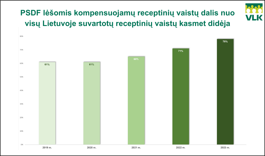 Grafikas: PSDF lėšomis kompensuojamų receptinių vaistų dalis nuo visų Lietuvoje suvartotų receptinių vaistų kasmet didėja