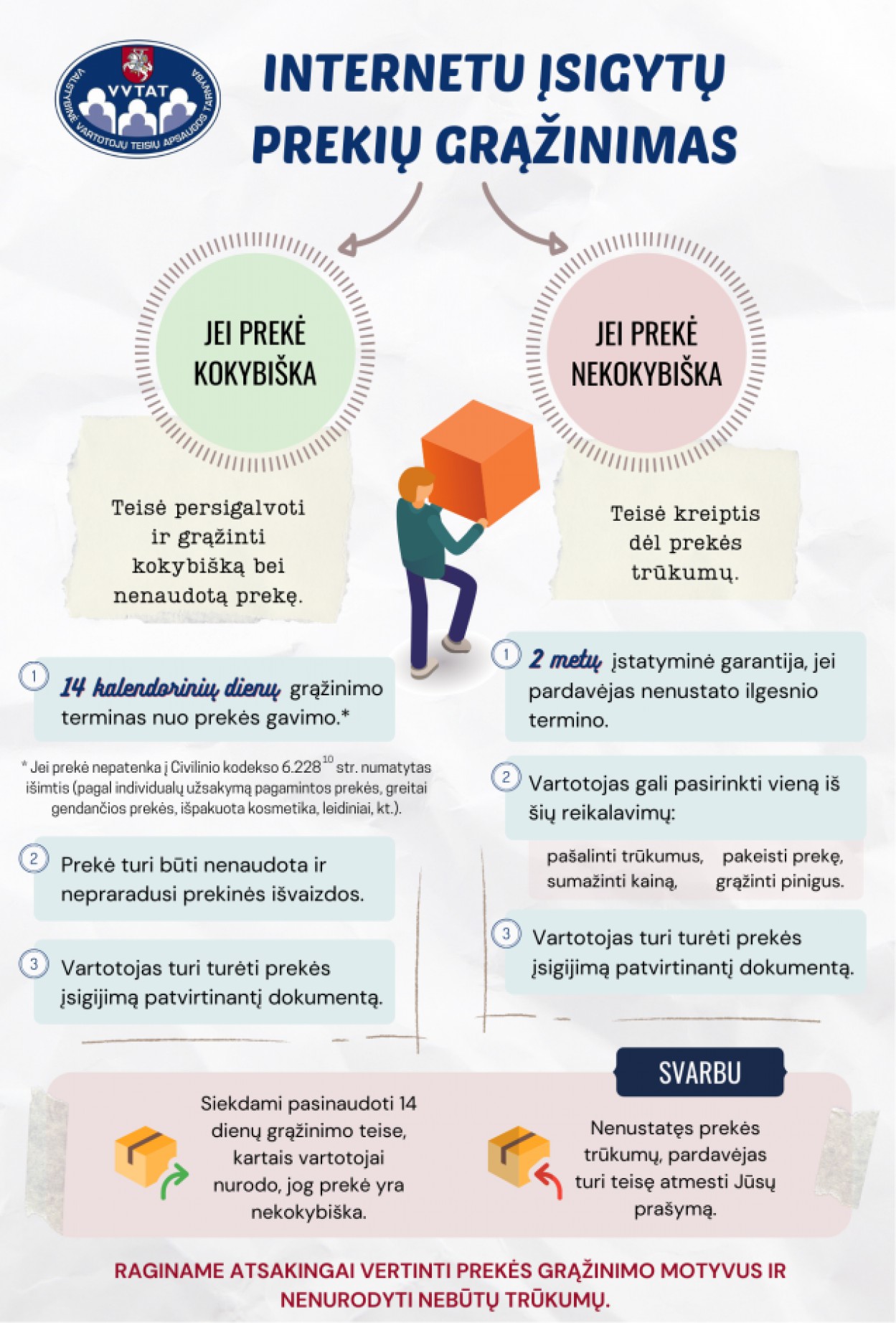 Pirkimas internetu tapo neatsiejama daugelio mūsų kasdienybe. Tačiau Valstybinė vartotojų teisių apsaugos tarnyba (VVTAT) pastebi, kad grąžindami internetu įsigytas prekes vartotojai neretai painioja dvi skirtingas teises – teisę grąžinti kokybišką prekę per 14 dienų bei teisę kreiptis dėl nekokybiškos prekės trūkumų. Priklausomai nuo to, kuria teise pageidaujate pasinaudoti, tokius prekės grąžinimo motyvus ir turite nurodyti pardavėjui.