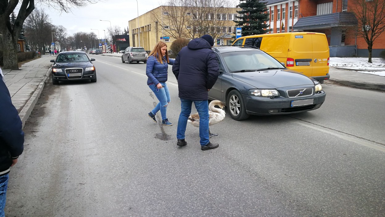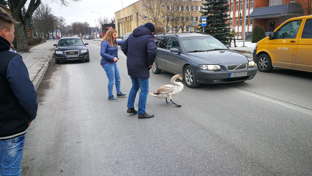 Jauna mergina pastebėjusi šią situacija, kartu su vyriškiu, vieninteliai sustojo, nepatingėjo išlipti iš šilto automobilio, ir bendromis pastangomis gulbiuką paragino nukeliauti ant žaliosios zonos. Pasak merginos, ji stebėjosi kitų vairuotojų abejingumu, kurie tik laviravo kelyje, aplenkdami, gal būt sužalotą paukštį.