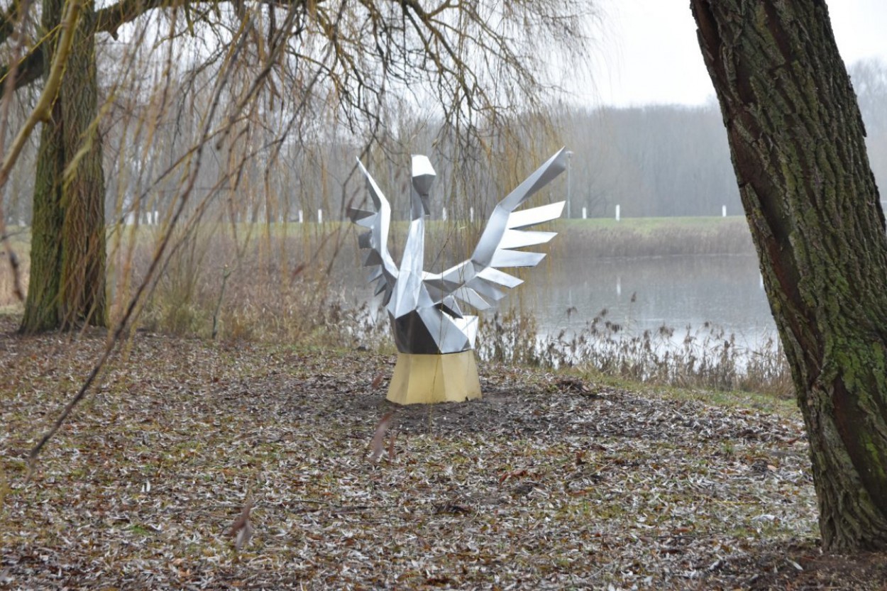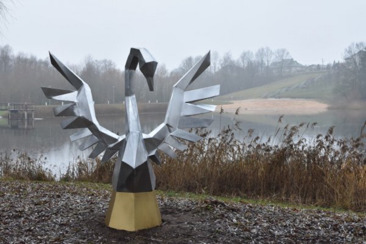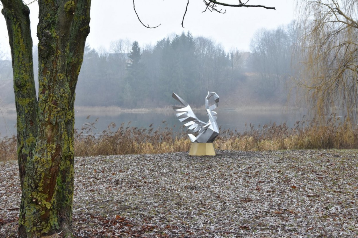 Jonavoje, Gulbių tvenkinio pakrantėje, Tvenkinio gatvėje „nutūpė“ metalinė gulbė – jonaviečio meistro Remigijaus Rabikausko kūrinys.