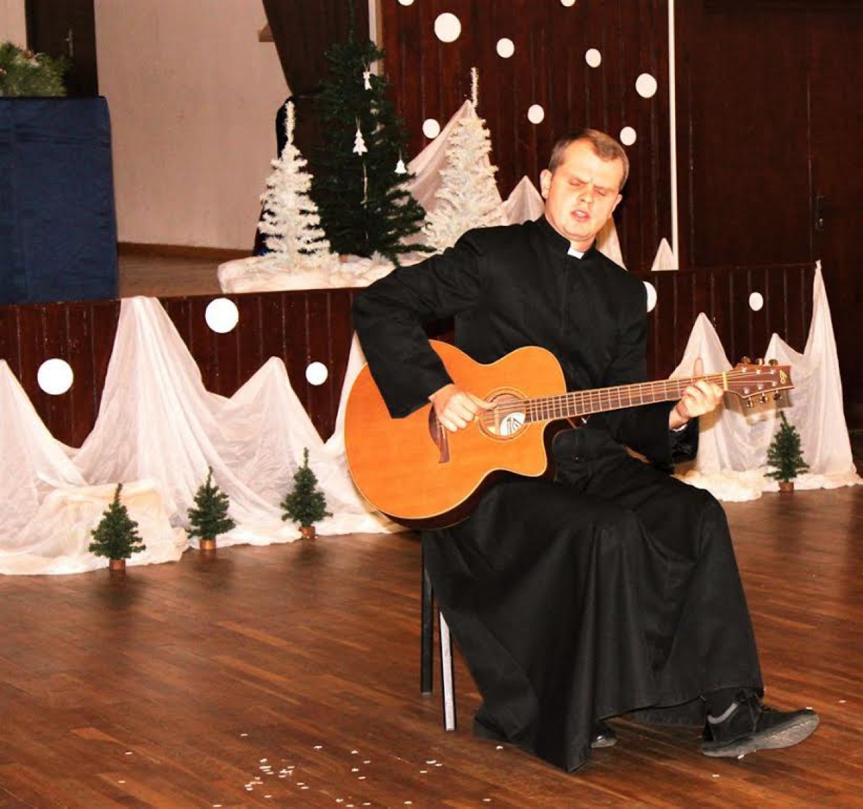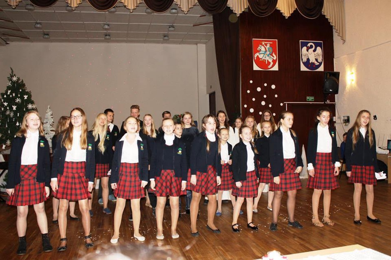 Susirinkusius užbūrė gitaros garsai ir svečio atliekamos dainos. Šventinę nuotaiką kūrė 5 klasės mokinės Deimantės Šimbaraitės ir jos mamos atliekama Kalėdinė giesmė, o vakaro pabaigoje visą bendruomenę suvienijo daina apie degantį židinį ir jaukius namus. Į juos iškeliavo ir angeliukas su geriausiais mokinių linkėjimais artėjančių švenčių proga.