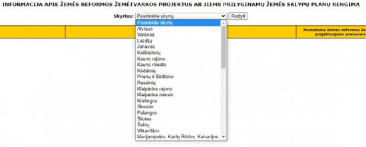 Pasirinkus dominantį NŽT teritorinį skyrių (kurio aptarnavimo teritorijoje yra suteiktas laikinai naudotis valstybinės žemės plotas), atsiverčia detalus (pagal kadastro vietoves ir metų ketvirčius) Projektų rengimo grafikas.