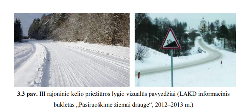 III – žemas priežiūros lygis turi užtikrinti eismo saugumą ir kelio tinkamumą naudoti, tačiau skiriamas mažas dėmesys kelio estetinei būklei. Neužtikrinamas kelio arba jo atskirų elementų ilgaamžiškumas. Galimi eismo nutrūkimai esant polaidžiui, sudėtingoms meteorologinėms sąlygoms žiemą. Pridedamas failas „Keliai.png“ 3.3 pav. III rajoninio kelio priežiūros lygio vizualūs pavyzdžiai.