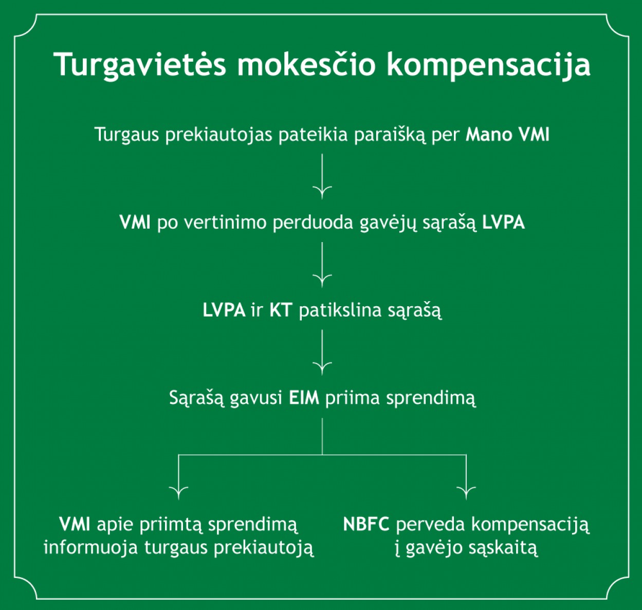 Gautas paraiškas VMI perduoda įvertinti ir VšĮ Lietuvos verslo paramos agentūrai (toliau – LVPA), kad pastaroji nustatytų, ar turgavietės mokesčio kompensacija neviršija didžiausios leistinos pagalbos sumos, nustatytos Europos Komisijos reglamentu. LVPA tinkamų finansuoti turgavietės prekiautojų sąrašą pateikia Ekonomikos ir inovacijų ministerijai. Pastarajai priėmus teigiamą sprendimą dėl kompensacijos skyrimo, prekiautojui skirtą kompensaciją perveda Nacionalinis bendrųjų funkcijų centras. Pavedimas atliekamas į vėliausiai prekiautojo Lietuvos finansų įstaigoje atidarytą banko sąskaitą.