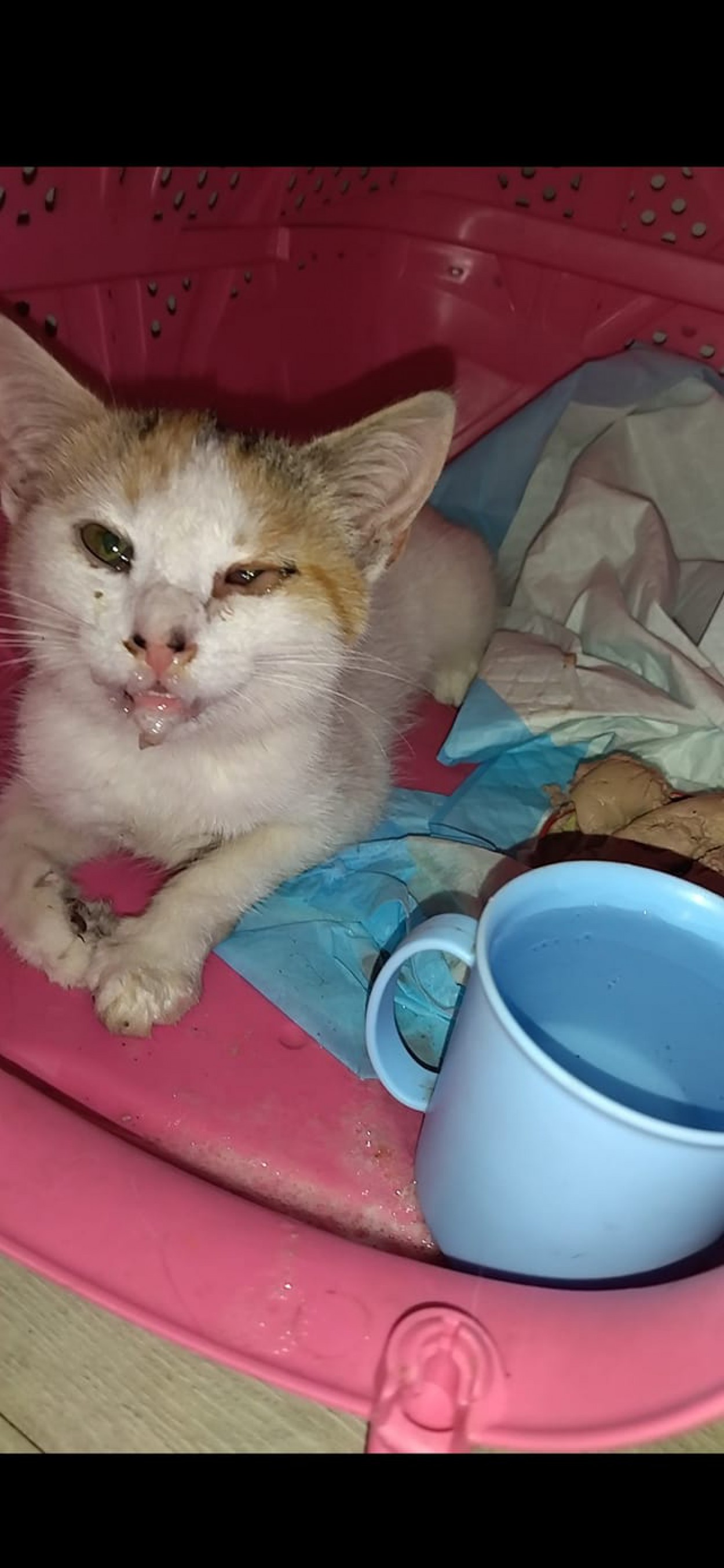,,Rastas apnuodytas ryžiukas. Jis - apatiškas, sunkiai kvėpuoja, labai viduriuoja, vemia, jo kūno temperatūra nukritusi. Katinukas gailiai miaukia, bando stotis ir eiti...