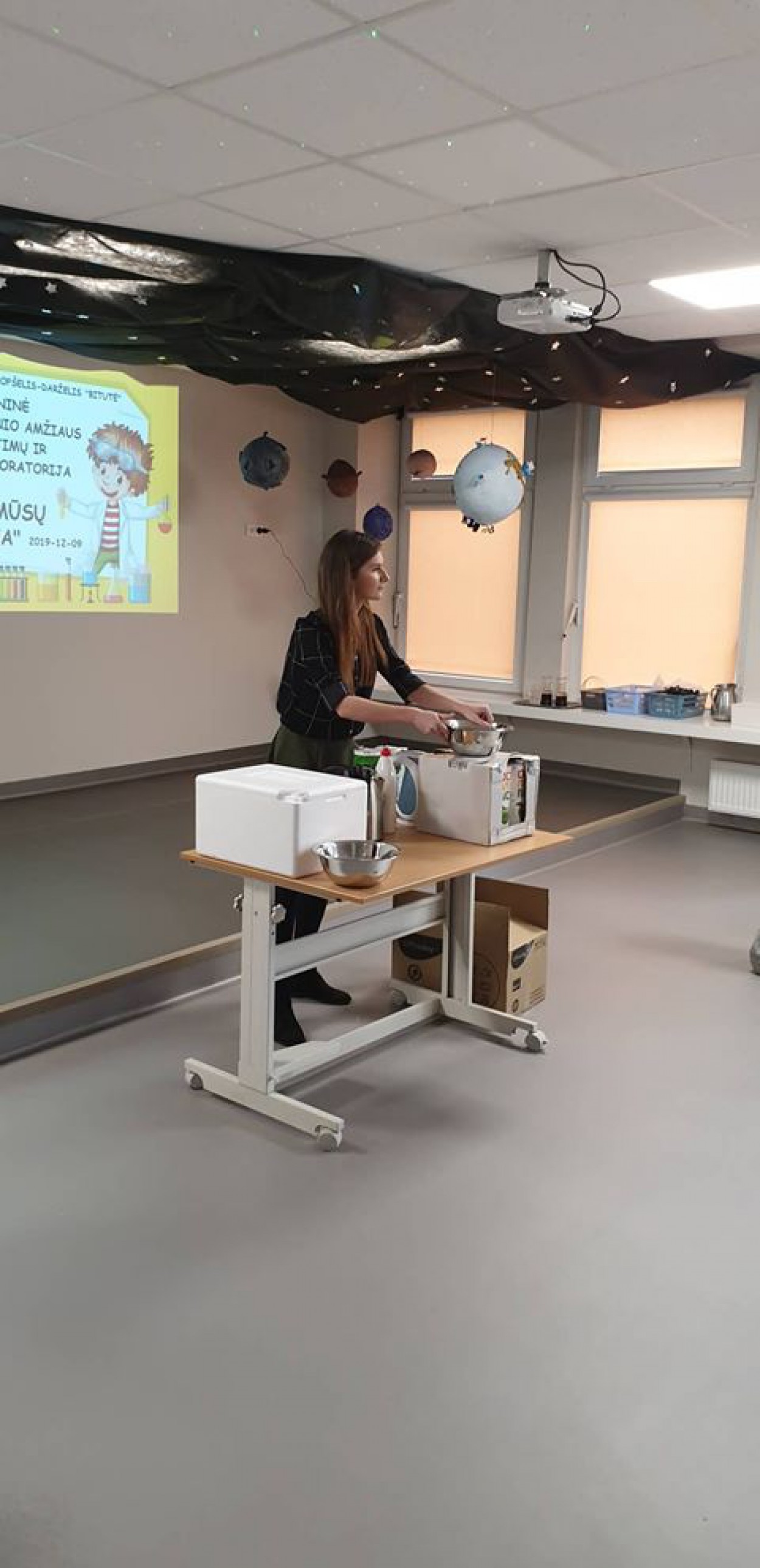 Į tyrimų ir atradimų laboratoriją atvyko Jonavos vaikų lopšelių-darželių „Žilvitis“, „Saulutė“, „Dobilas“, Justino Vareikio progimnazijos ir Panerio pradinės mokyklos komandos. Visus susirinkusiuosius pasveikino Mažasis princas (meninio ugdymo mokytojas Mantas Kučinskas) ir teatro studijos artistai, kurie suvaidino pasaką „Juodoji tetulė“. Jaunieji „mokslininkai“ pristatė namų darbus – įvairius bandymus ir eksperimentus, papasakojo, ką pavyko išsiaiškinti juos atliekant. Mažojo princo ir Mokslininko geografo (mokytoja Edita Vaznaitienė) lydimi pasinėrė į paslaptingą tyrinėjimų ir atradimų kelionę. Drauge aiškinosi įvairius reiškinius vykstančius mūsų planetoje Žemėje, pasižadėjo įgytas žinias naudoti tik geriems darbams.