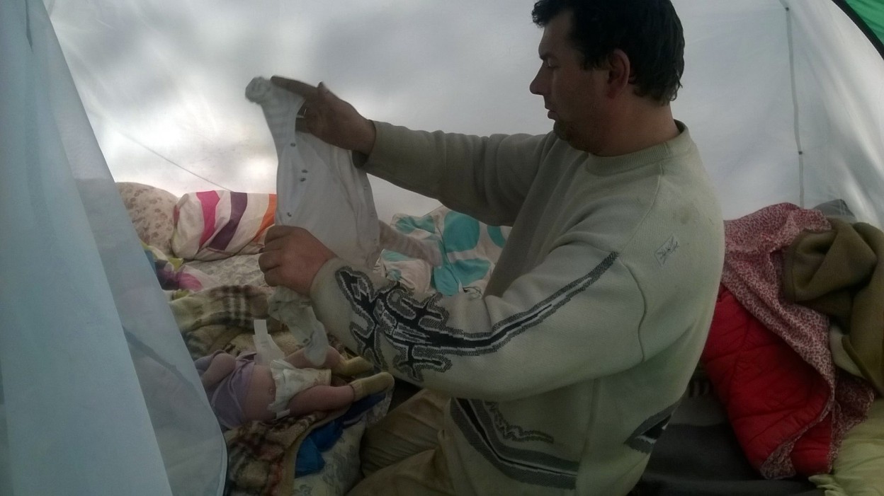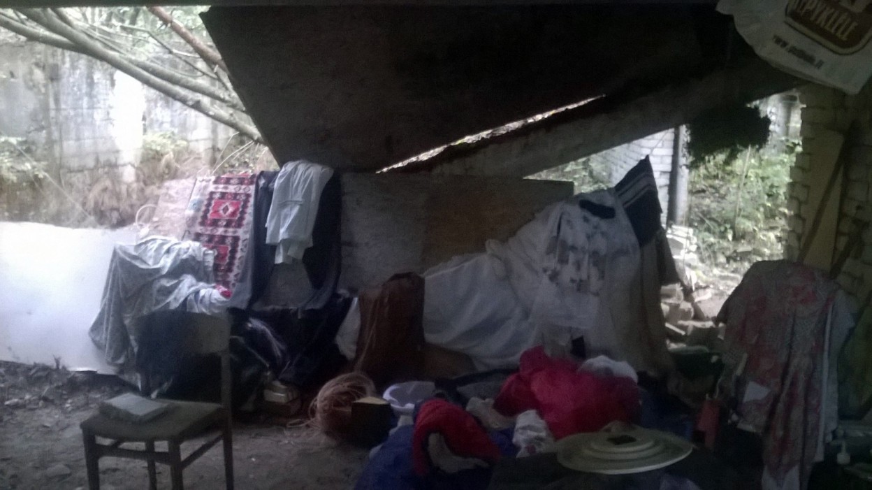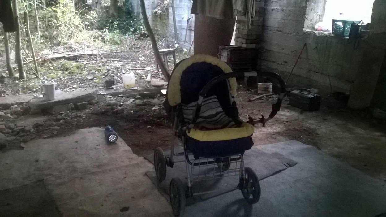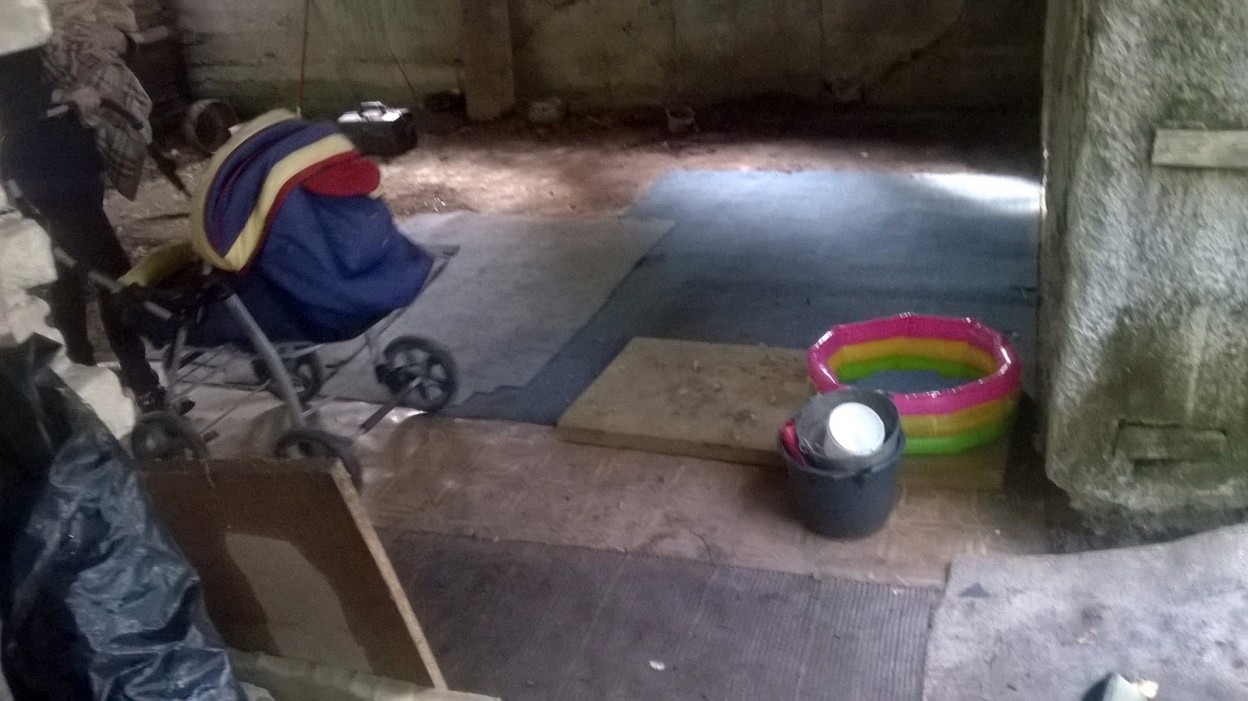 Atskirose apgriuvusio pastato erdvėse “įrengta” virtuvė ir miegamasis, netoliese pastatyta palapinė. Čia pat, beveik lauke, trijų mėnesių kūdikis buvo ir perrenginėjamas. Nors greta sumūrytas pečius, tačiau jo šiluma beveik atviros vietos sušildyti tiek, kad būtų galima gyventi, negali.