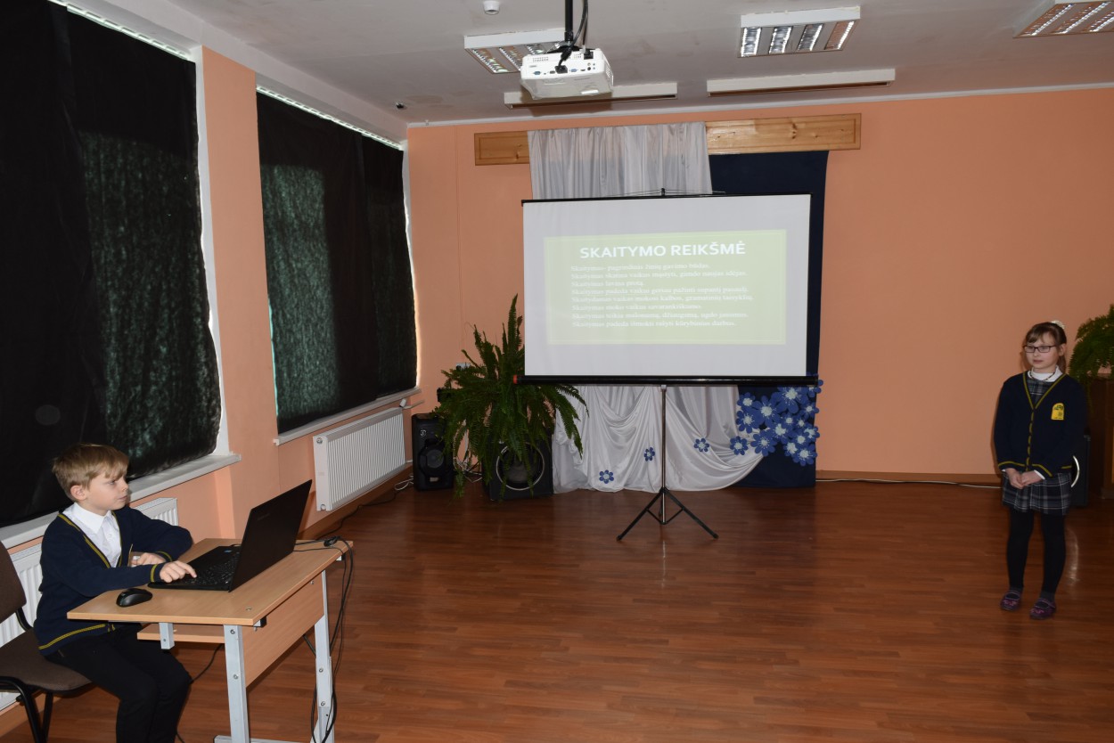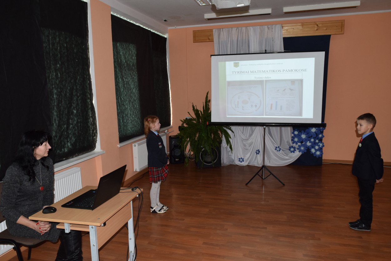 Mūsų mokyklos mokytojos Valentinos Palaimienės paruoštos 1 kl. mokinės – Gustė Paškauskaitė bei Lėja Vasiliauskaitė pristatė projektą „Matematika aplink mus“. 4 kl. mokiniai –Ugnė Milickaitė, Karolis Onaitis ir Eitvydė Pakalniškytė, vadovaujami mokytojos A. Liutkevičienės, pakvietė susipažinti su jų vykdytu projektu „Tyrinėju, atrandu, pažįstu“.
