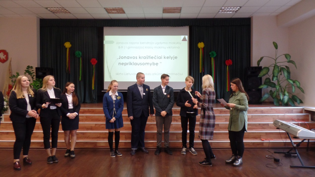 Jonavos Justino Vareikio progimnazijoje vyko viktorina „Jonavos kraštiečiai kelyje į nepriklausomybę“, skirta Lietuvos valstybės atkūrimo šimtmečiui. Joje dalyvavo rajono ir miesto mokyklose besimokančių 8-9 klasių ir pirmų gimnazijos klasių moksleivių komandos. Tiksliau sakant, krašto istorinius įvykius gerai išmanantys vaikai buvo sugrupuoti į komandas po keturis iš skirtingų ugdymo įstaigų. Kiekviena komanda buvo simboliškai pavadinta tam tikra raide.