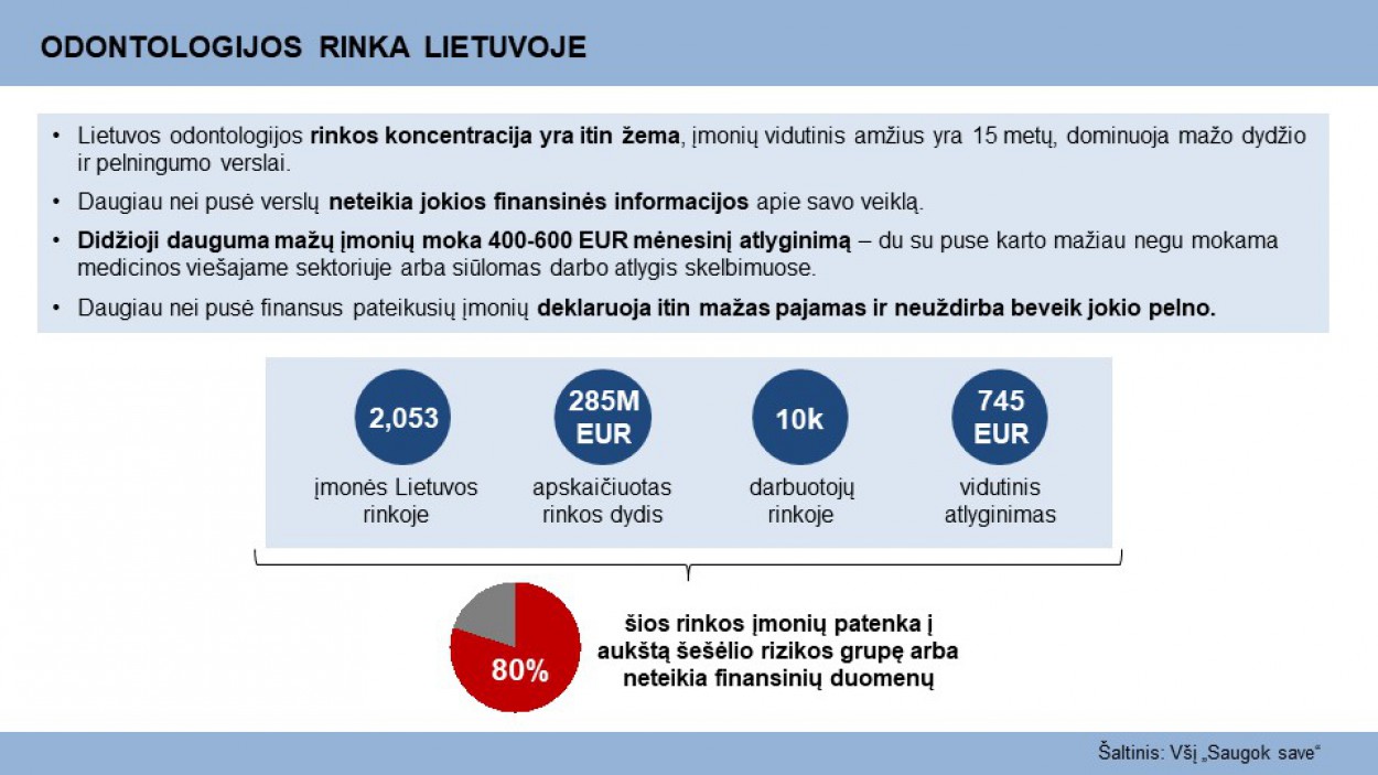 Atlikta Lietuvos odontologijos rinkos analizė rodo galimai pavojingas tendencijas, kurios atsirado 30 metų nesprendžiant šios rinkos skaidrumo klausimo: odontologijos sritis išlieka viena iš labiausiai probleminių sričių, kur šešėlinė ekonomika siekia galimai dešimtis milijonų eurų.
