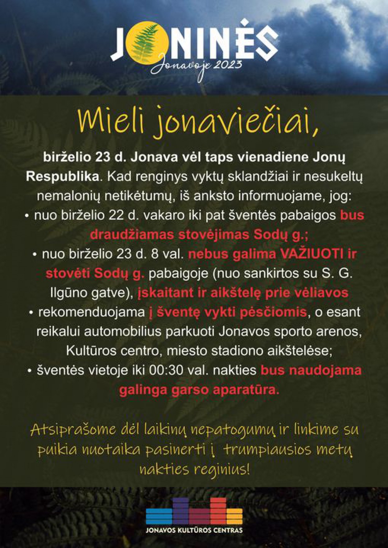 birželio 23-iąją Jonava vėl taps vienadiene Jonų respublika. Kad renginys vyktų sklandžiai ir nesukeltų nemalonių netikėtumų, iš anksto informuojama, jog: