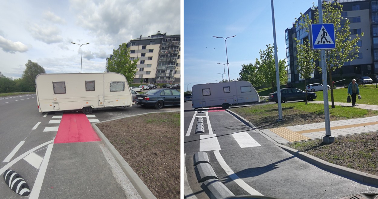 Vienok jau ir sekmadienį, ir šiandien, pirmadienį, dėmesį patraukė ne tik sankryžos atidarymas, bet netoliese, netinkamai, ant dviračių tako priparkuotas prikabinamas namukas ant ratų.