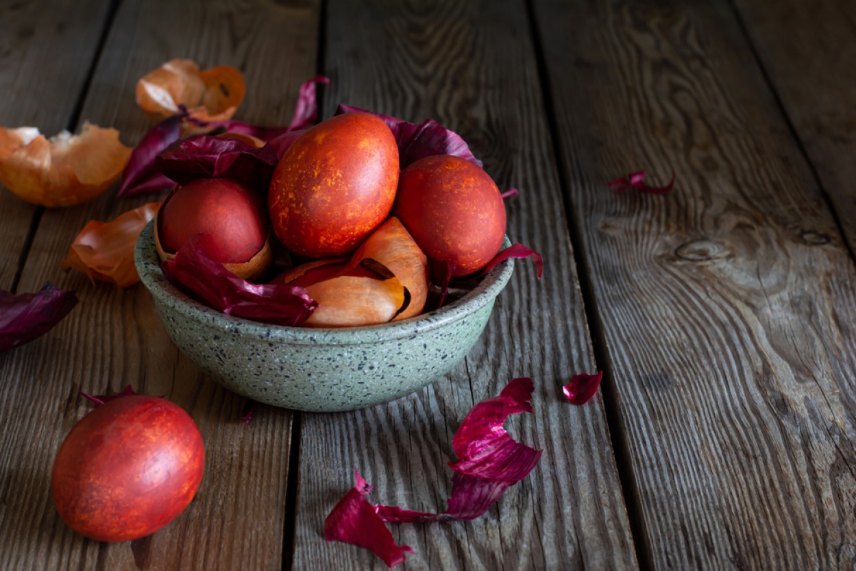 Vaivorykštės viršuje – ryški raudona spalva. Ją margučiams išgausite panaudoję raudonuosius svogūnus. Pusei litro vandens reikės dviejų stiklinių raudonojo svogūno laiškų. Norint dar sodresnės spalvos, įdėkite daugiau laiškų, taip pat šiais dažais dažykite ne balto, o rudo lukšto kiaušinius. Tik šią savaitę visose prekybos tinklo „Lidl“ parduotuvėse kilogramas lietuviškų raudonųjų svogūnų – vos už 0,89 Eur, arba net 40 proc. pigiau. Svogūnų lukštus, be abejo, panaudosite kiaušiniams marginti, o patys svogūnai pagardins tiek įvairias salotas, tiek ir mėsiškus Velykų stalo patiekalus.