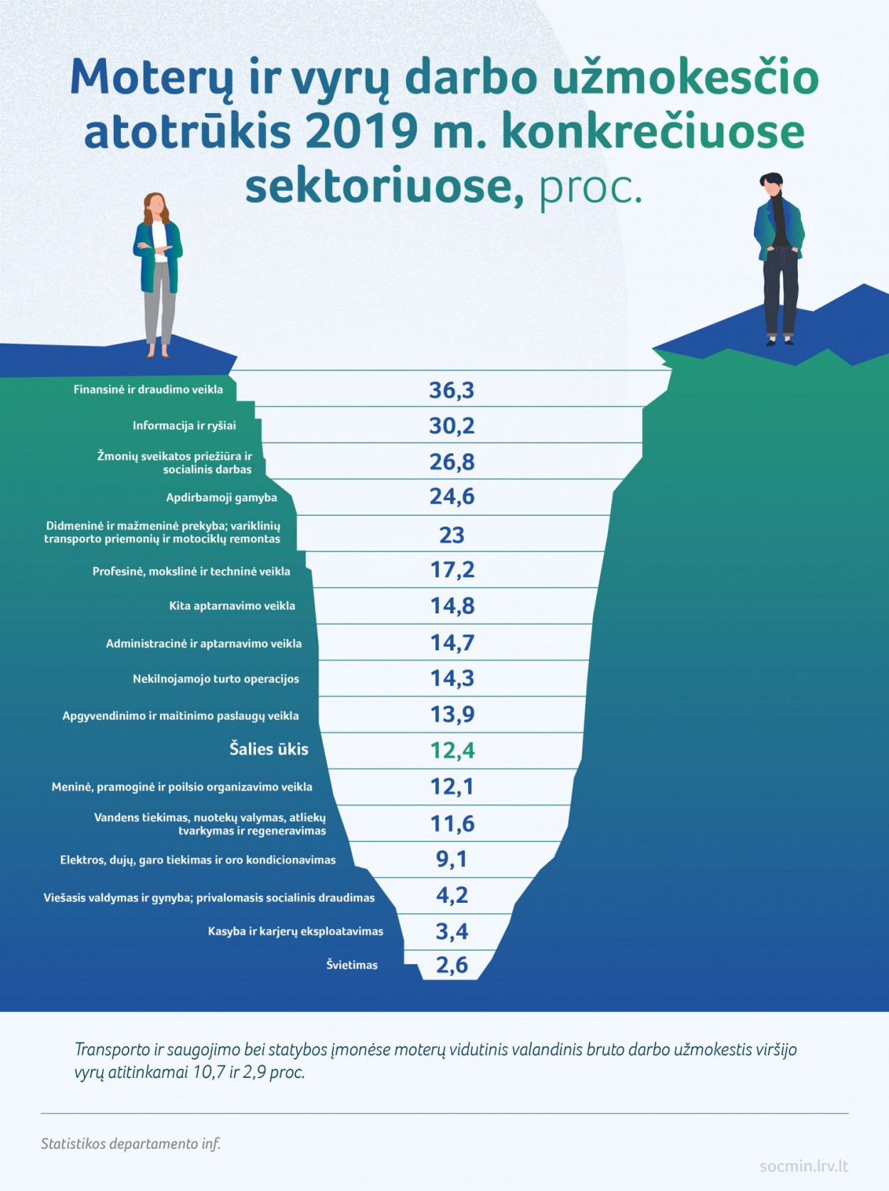 Analizuojant darbo užmokesčio skirtumus konkrečiose ūkio šakose, paaiškėjo, kad, pavyzdžiui, informacijos ir ryšių srityje moterų darbo užmokestis buvo ir 30,2 proc. , o finansinėje ir draudimo veikloje – 36,3 proc. mažesnis nei vyrų.