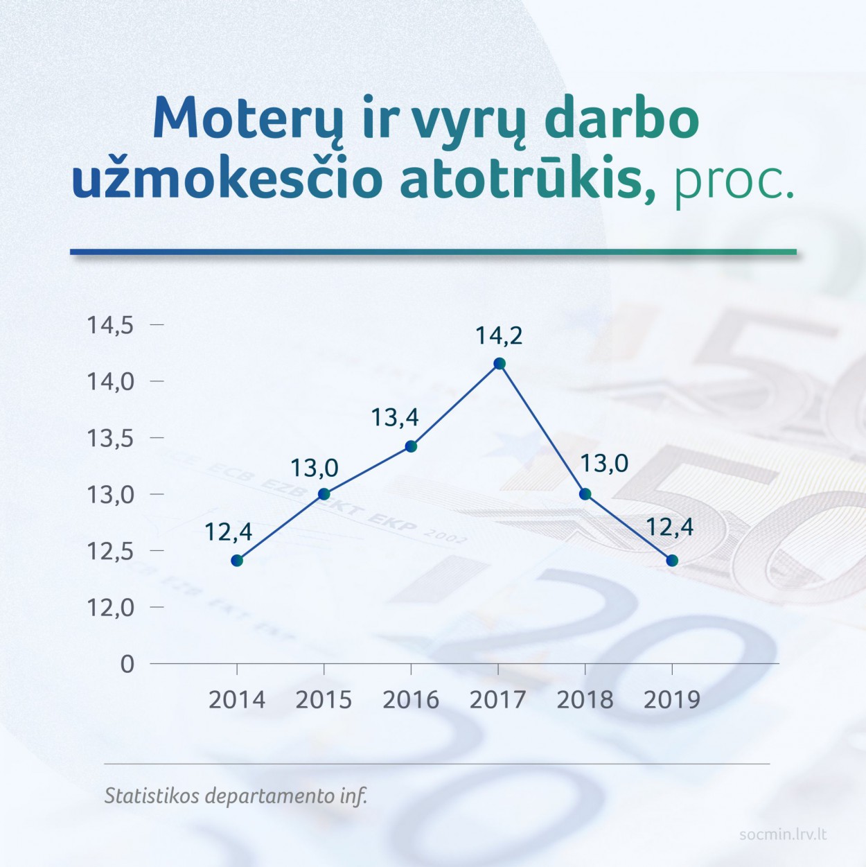 Remiantis Statistikos departamento duomenimis, 2019 metais atotrūkis tarp moterų ir vyrų darbo užmokesčio siekė 12,4 proc. Tai – tiek pat, kaip ir 2014 metais, po kurių iki pat 2017-ųjų šis rodiklis augo. 2018 ir 2019 metais pastebimas atotrūkio mažėjimas, tačiau ekspertai teigia, kad statistiką pakoregavo ne geresnė lyčių lygybės situacija, o ekonominiai procesai: padidėjęs vyrų nedarbas, augę viešojo sektoriaus darbuotojų atlyginimai, nes moterys jame sudaro didžiąją daugumą darbuotojų.