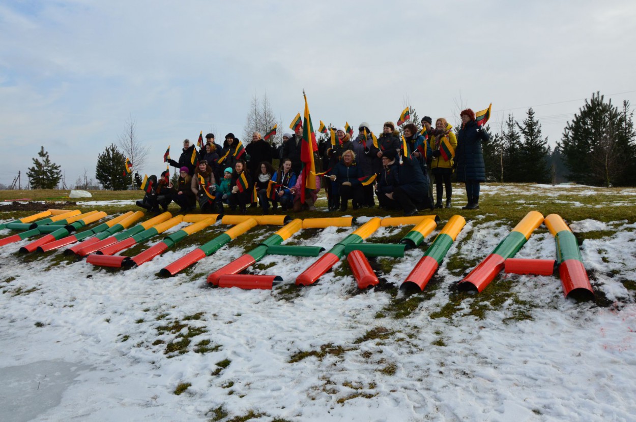 Panoterių miestelio gyventojai, pakviesti seniūnaičio Eugenijaus Šeinausko, kūrė vėliavos spalvų instaliaciją.