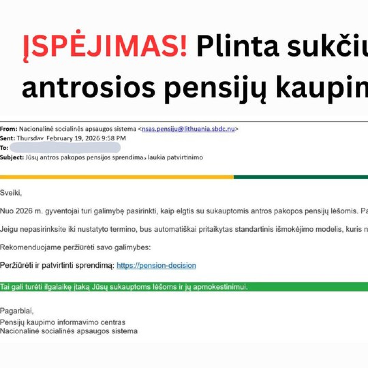 Institucijų atsakomybės neatitikimai. Informacija apie antrosios pensijų pakopos kaupimą teikiama per oficialias institucijų sistemas ir asmenines paskyras (pvz., per asmeninę „Sodros“ paskyrą gyventojui). Bendrinio pobūdžio laiškai su raginimu spausti išorinę nuorodą nėra įprasta praktika.