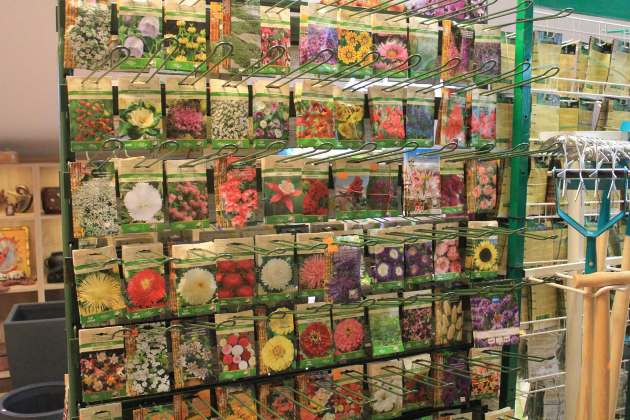 Parduotuvėje - platus „Žalios stotelės“ sėklų pasirinkimas, darbo apranga ir kitos prekės sodo darbams.