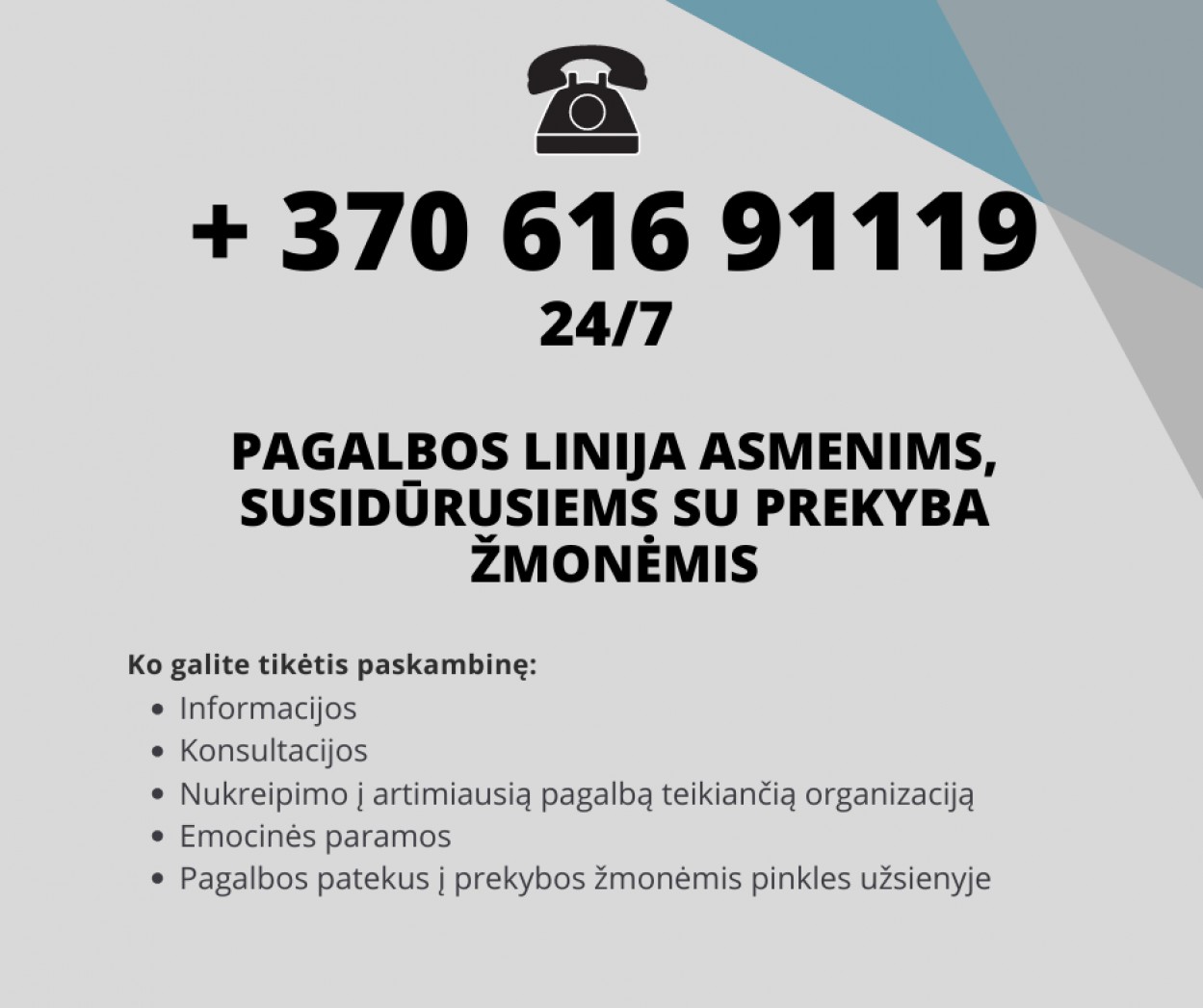 Nukentėjai nuo prekybos žmonėmis? Ieškai socialinės, psichologinės, teisinės pagalbos ar emocinės paramos? Atrodo įtartinas darbo pasiūlymas užsienyje? O gal jau patiri išnaudojimą ir nežinai kur kreiptis?Kas bebūtum - pats nukentėjęs ar abejojantis, pareigūnas ar socialinis darbuotojas, jei turi įtarimų, kad tau ar žmogui su kuriuo susidūrei savo kelyje gresia išnaudojimas ar jis jau yra išnaudojamas - paskambink mums.