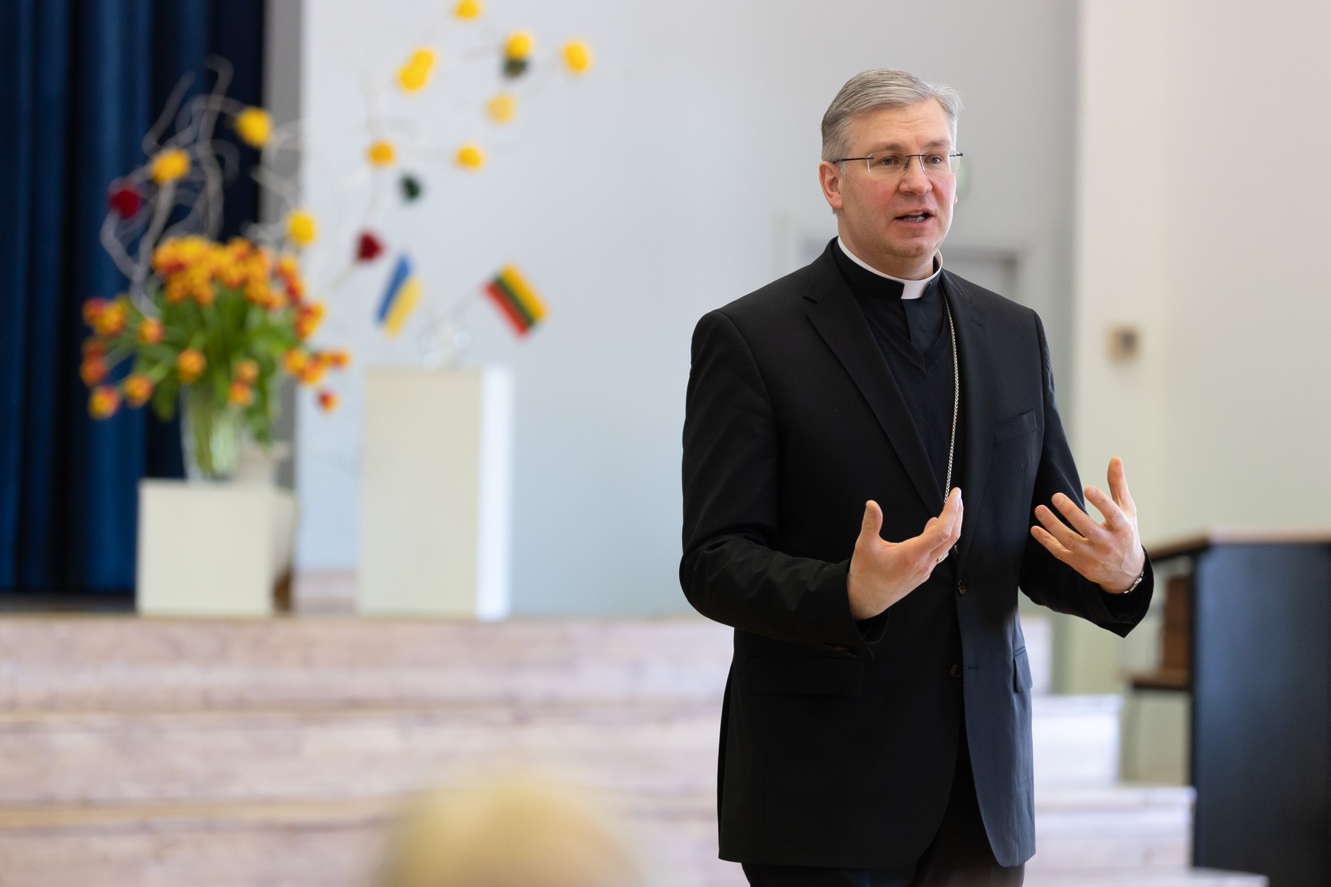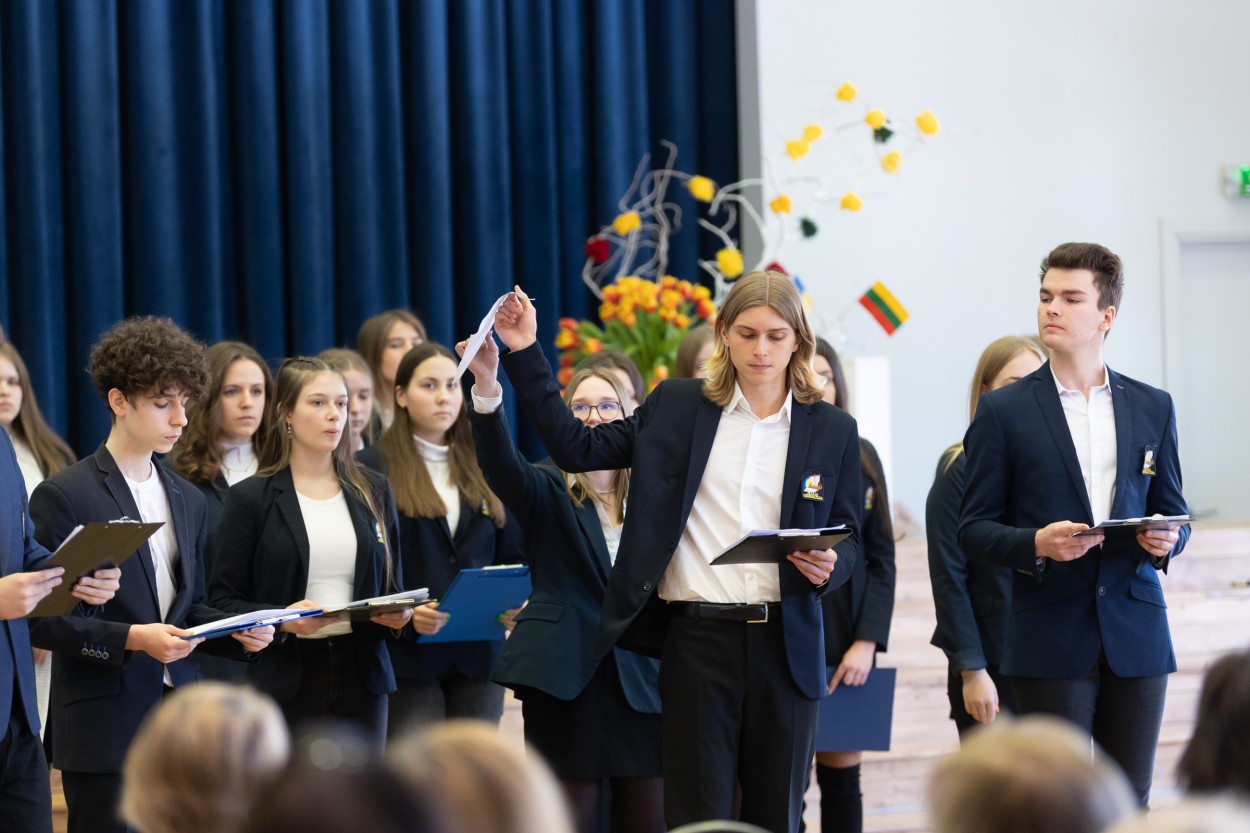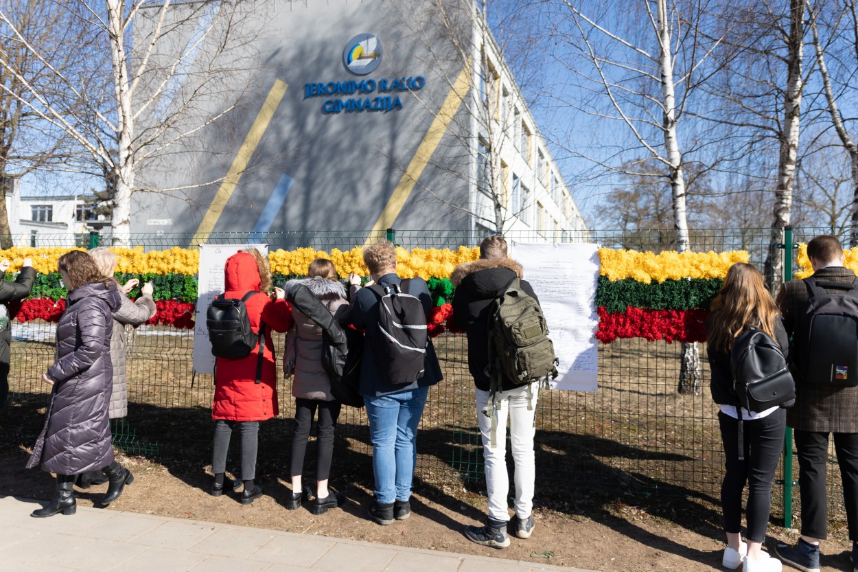 Minėdami istorinę datą, jaunieji raliečiai atvertė Just. Marcinkevičiaus dramos ,,Mindaugas“ puslapius. Teatro bei muzikos studijos (mokytojos Živilė Martinaitienė, Neringa Kukarinienė) meninėje programoje jungėsi žodis, daina, jaunystė ir klausimai: ar mūsų tauta gali būti vieninga, ar dar yra vietos mūsų padangėje baltam paukščiui? Renginyje dalyvavo garbingi svečiai – Jonavos šv. apašt. Jokūbo parapijos klebonas kun. Virginijus Birjotas ir Kauno arkivyskupas kun. Kęstutis Kėvalas. ,,Gyvenimas ir pasaulis yra trapus. Guodžiamės viltimi, kad lūžiai pasaulyje yra šviesos ir naujos istorijos pradžia“,- tarė vilties žodžius Kęstutis Kėvalas ir palaimino gimnazijos bendruomenę.