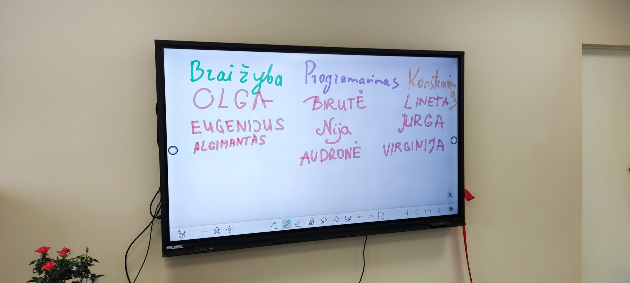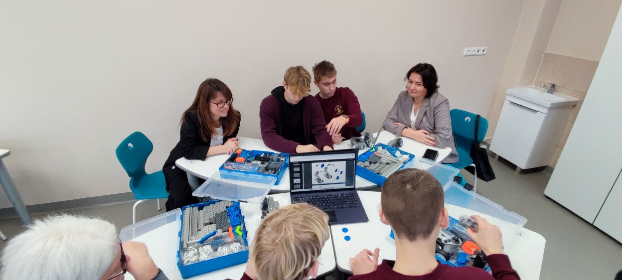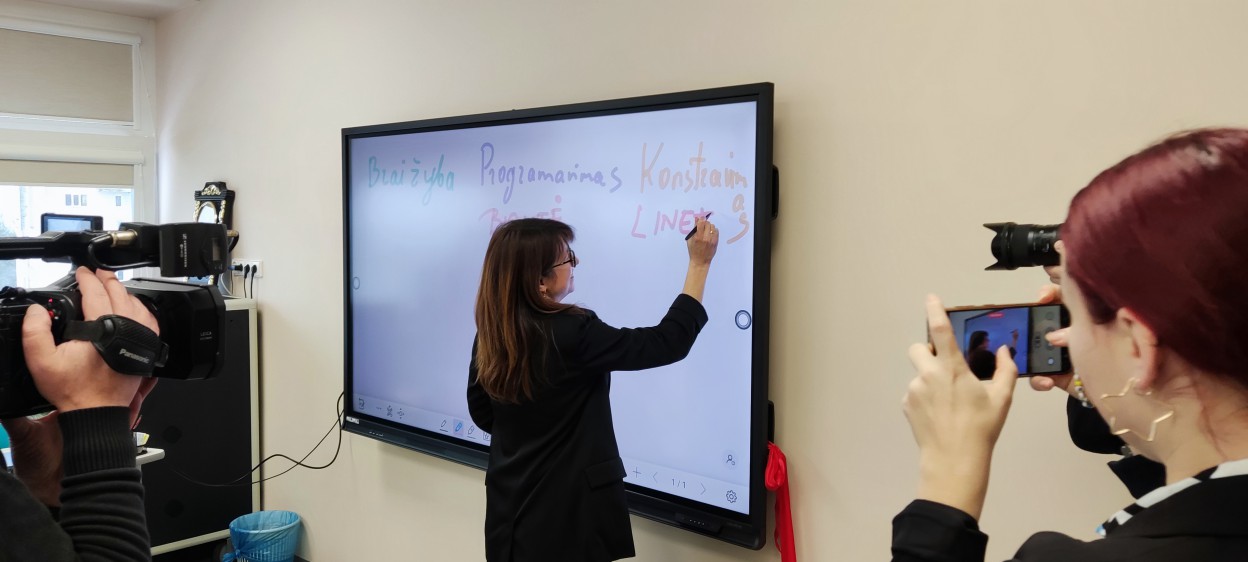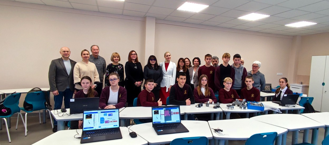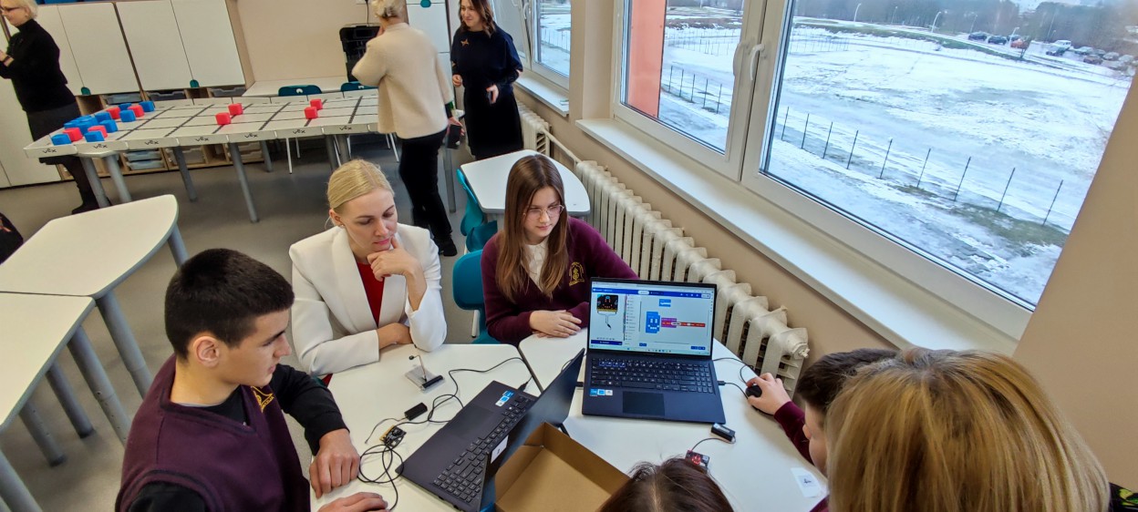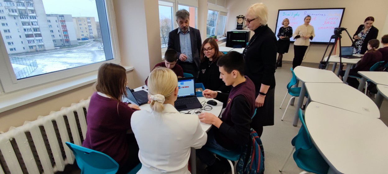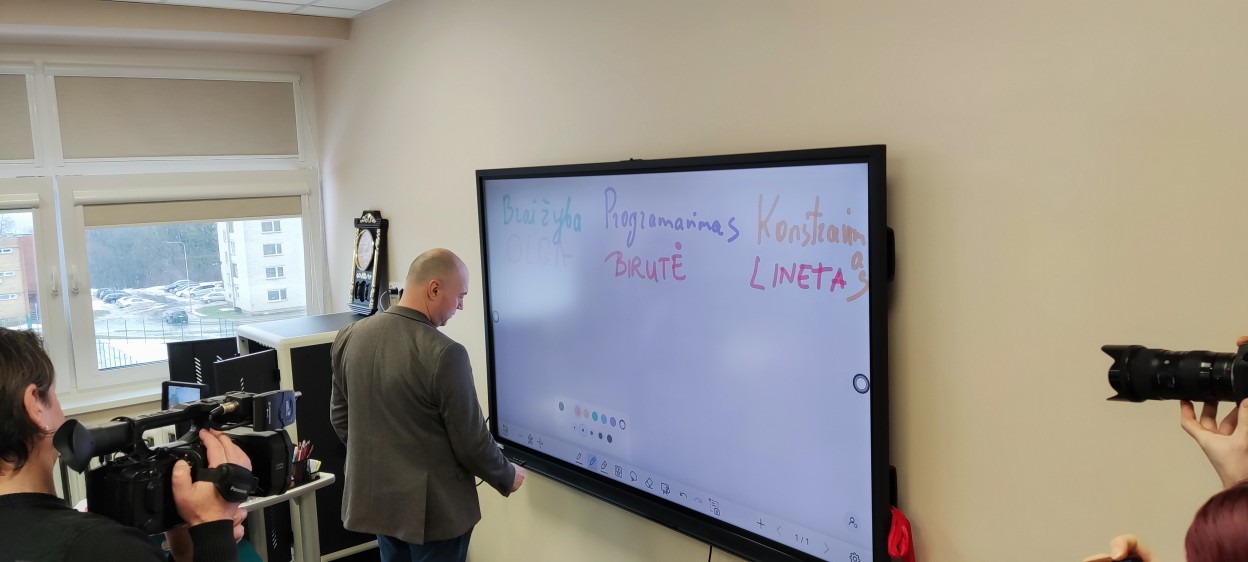 Atidarytoje STEAM laboratorijoje įvyko ir pamoka, kurioje sudalyvauti galėjo ir į atidarymą atvykę svečiai kartu su mokiniais. Sudarytos trys komandos konstravo robotus, programavo muziką, braižė brėžinius.