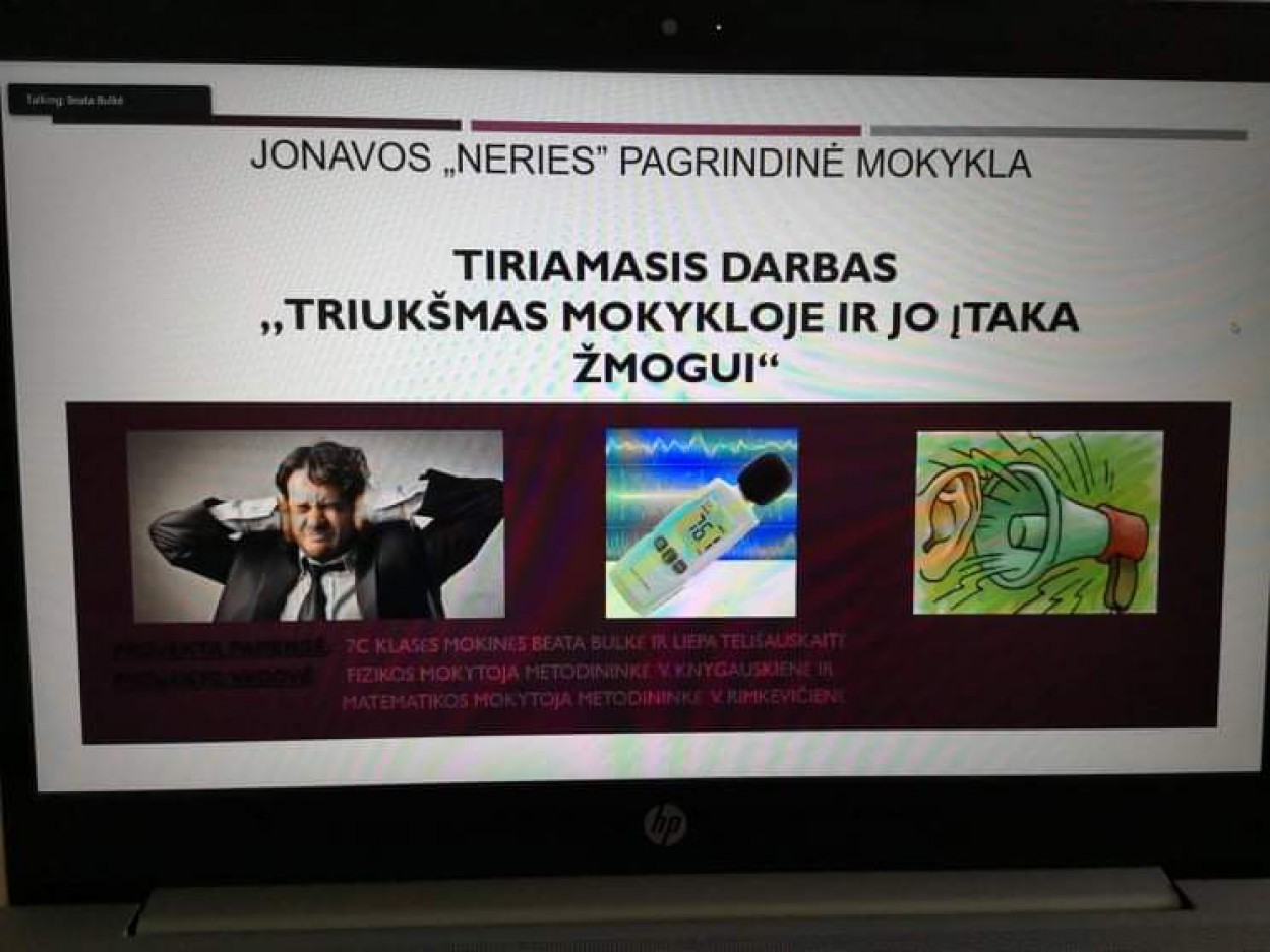 Darbą pradėjome Jonavos ,,Neries” pagrindinės mokyklos 7 klasės mokinių Liepos Telišauskaitės ir Beatos Bulkės atliktu tyrimu ,,Triukšmas mokykloje ir jo įtaka žmogui” (darbo vadovės Violeta Knygauskienė, fizikos mokytoja metodininkė, ir Vilija Rimkevičienė, matematikos mokytoja metodininkė). Mergaitės skirtingomis savaitės dienomis pamokų ir pertraukų metu matavo triukšmą mokykloje. Gautus duomenis palygino su normalia triukšmo riba, kuri nekenkia žmogui.