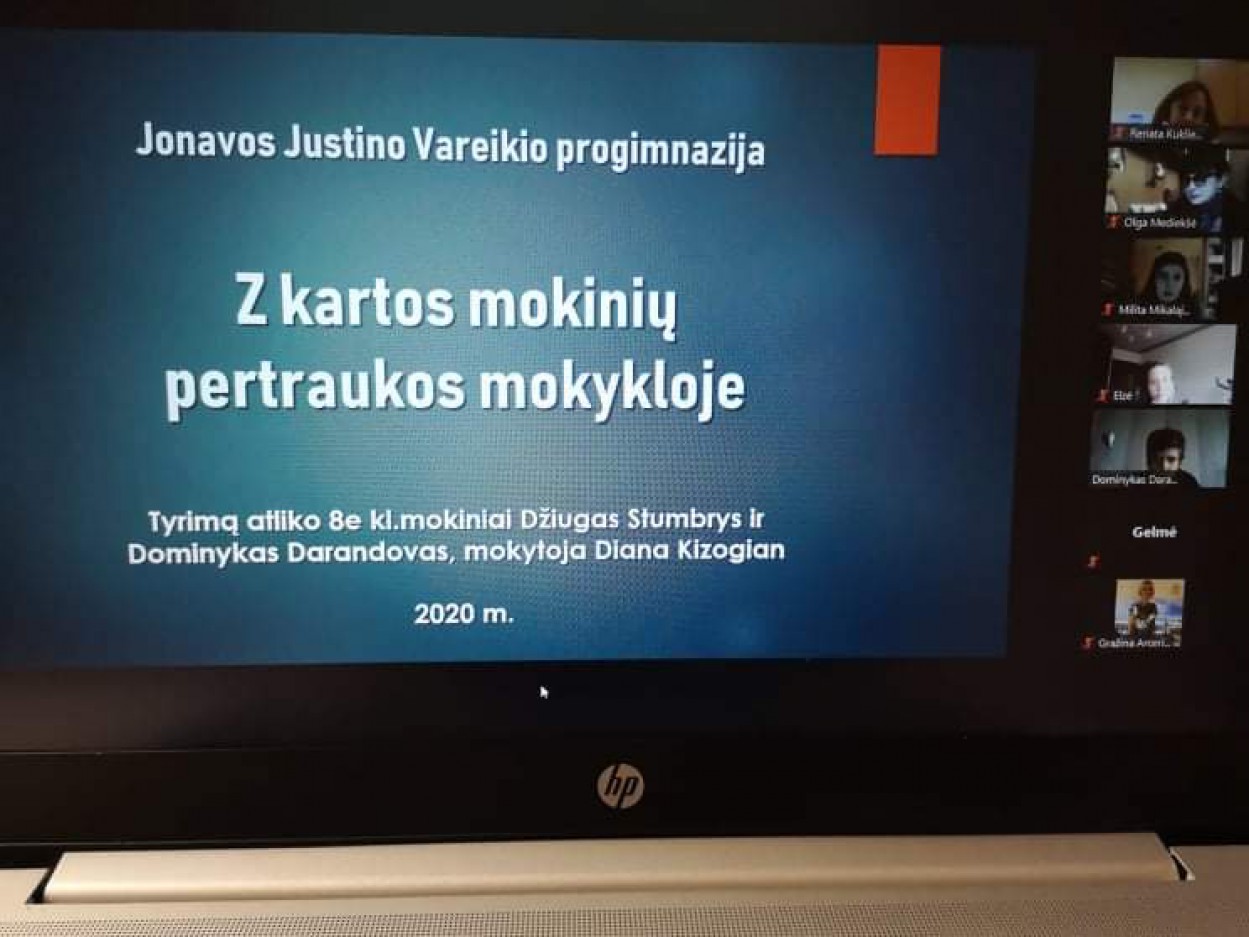 Jonavos Justino Vareikio progimnazijos 7 klasės mokiniai Faustas Jakovlevas ir Dovydas Višumirskis (darbo vadovė Gražina Arcerienė, matematikos ir IT mokytoja metodininkė) atliko darbą ,,Virtualių mokymosi aplinkų naudojimas nuotolinio mokymosi metu”. Moksleiviai pateikė statistinius duomenis, kaip naudojamos šios aplinkos.