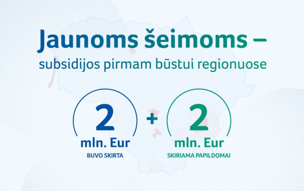 Jaunoms šeimoms išreiškus susidomėjimą programa, kuri leidžia pasinaudoti valstybės subsidija pirmam būstui regione įsigyti ar pasistatydinti, Socialinės apsaugos ir darbo ministerija šiam tikslui papildomai skiria 2 mln. eurų 2018 metams. Tai reiškia, kad iš viso finansinėms paskatoms pirmajam jaunų šeimų būstui šiais metais bus skiriama 4 mln. eurų.