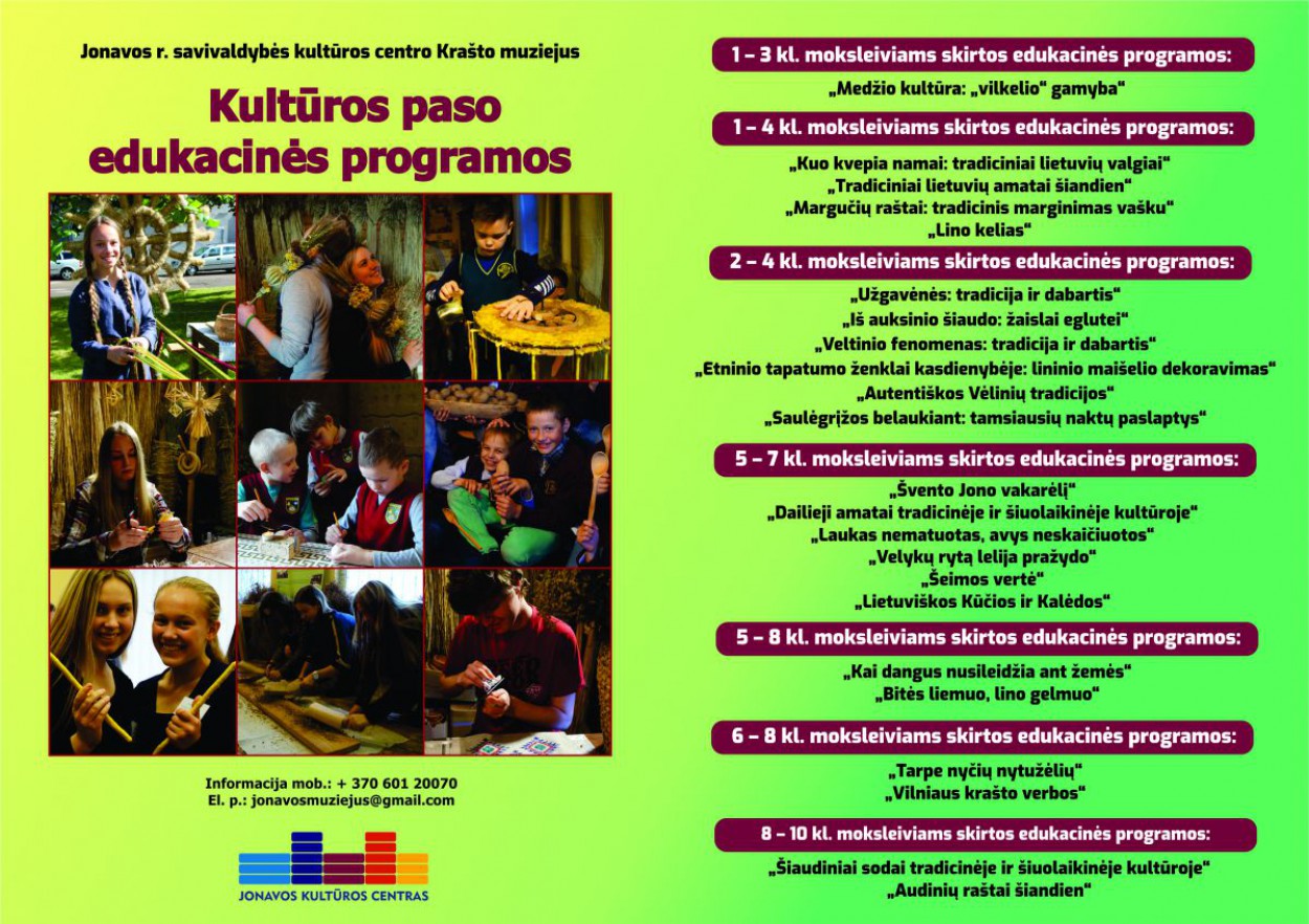 Programos parengtos remiantis autentiška etnografine medžiaga, iliustruotos audio ir video medžiaga, vedamos nuolat aktyvinant mokinio jusles. Patyrusios Krašto muziejaus edukatorės Rasos Kulytės-Libienės vedami edukaciniai užsiėmimai pritraukia gausų moksleivių būrį ne tik iš Jonavos, bet ir Kauno, Vilniaus, Ukmergės, Kėdainių, Panevėžio, Raseinių bei kitų Lietuvos miestų bei rajonų!