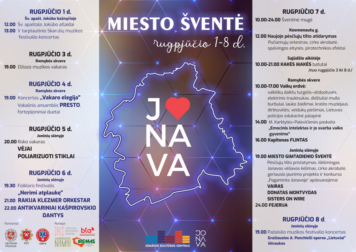 19 val. MIESTO GIMTADIENIO ŠVENTĖ. Pėsčiųjų tilto pristatymas, iškilmingas Jonavos vėliavos kėlimas, cirko akrobatė, geriausio jaunimo projekto ir konkurso „Pagaminta Jonavoje“ apdovanojimai.