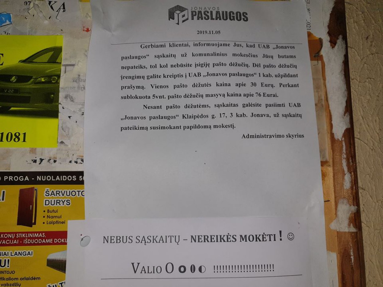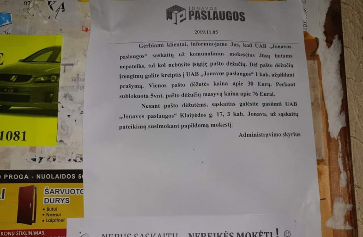 ,,Gerbiami klientai, informuojame Jus, kad UAB ,,Jonavos paslaugos" sąskaitų už komunalinius mokesčius Jūsų butams nepateiks tol, kol nebūsite įsigiję pašto dėžučių. Dėl pašto dėžučių įrengimų galite kreiptis į UAB ,,Jonavos paslaugos" 1 kab. užpildant prašymą. Vienos pašto dėžutės kaina apie 30 Eurų. Perkant sublokuotą 5 vnt. pašto dėžučių masyvą kaina apie 76 Eurai.