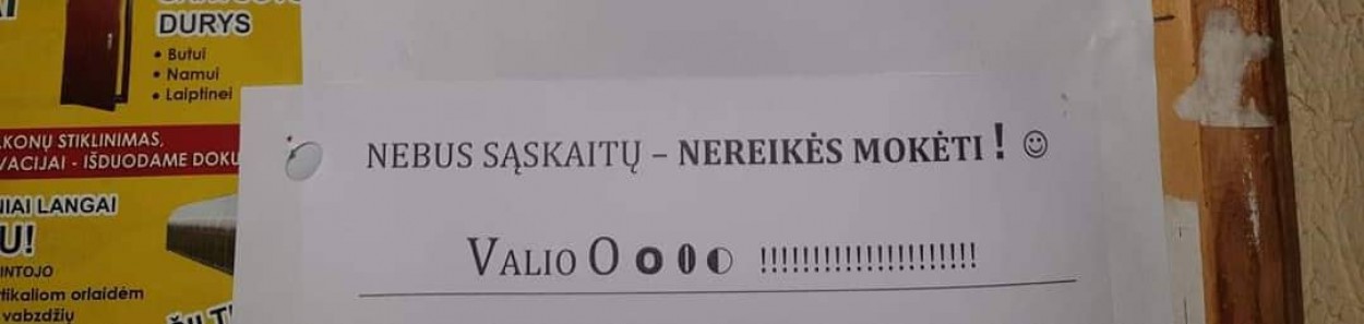 ,,Nebus sąskaitų – nereikės mokėti. Valio“, - rašoma lape, pakabintame tiesiai po aprašyta ,,Jonavos paslaugų“ informacija.