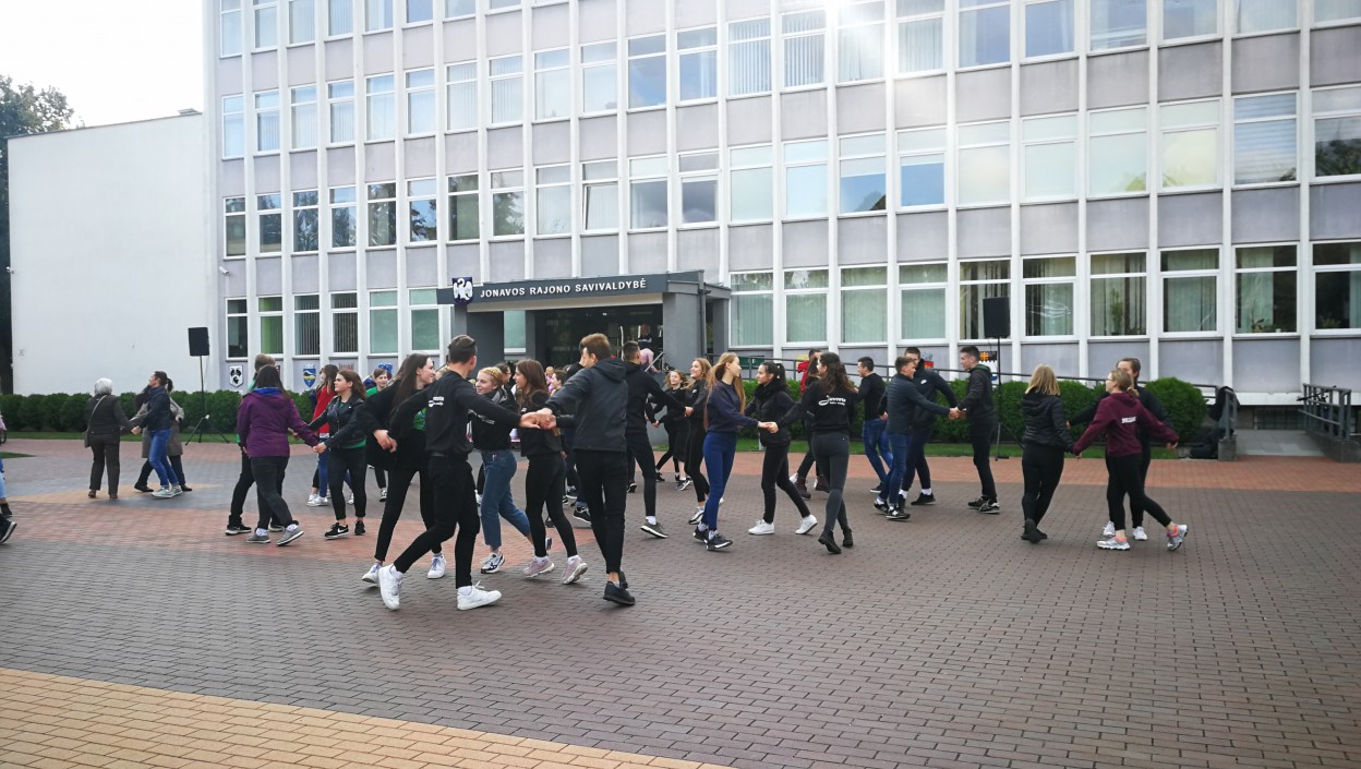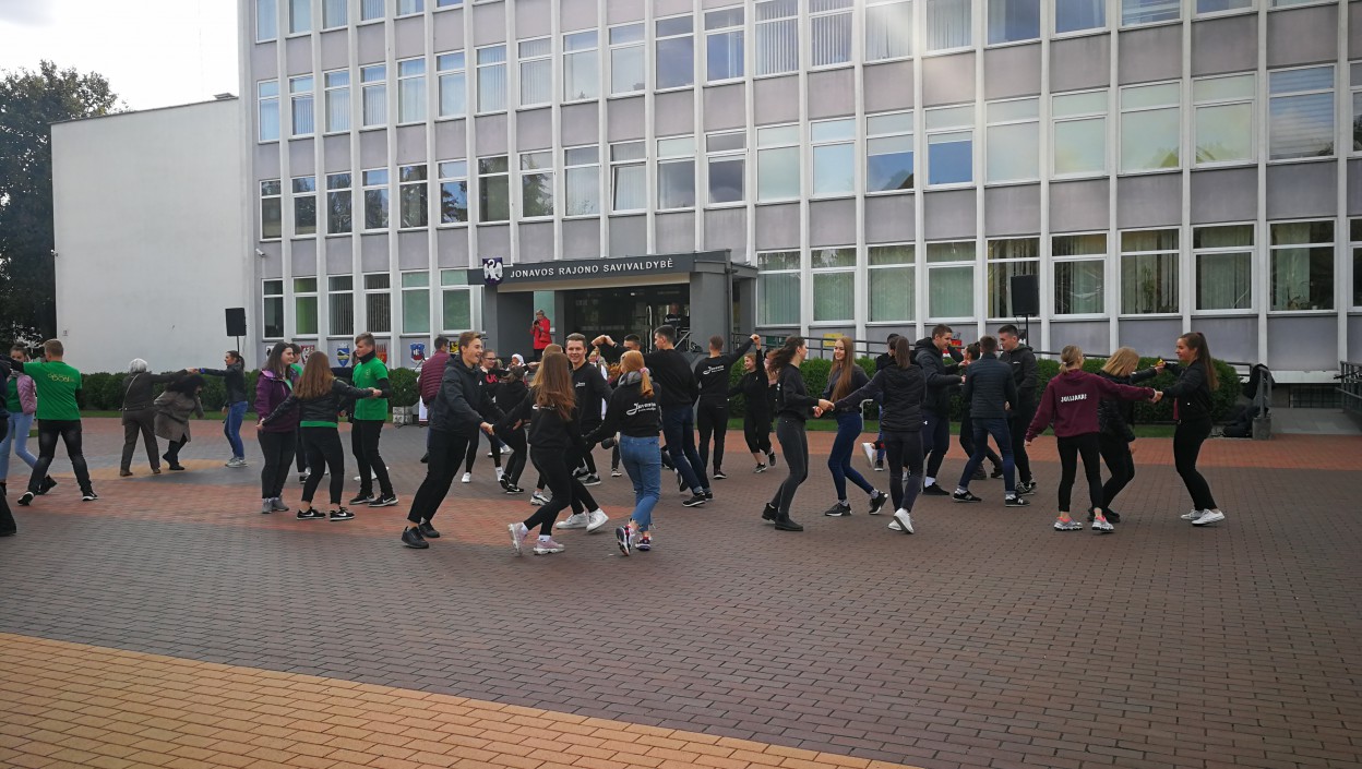 Jonavoje į akciją „Visa Lietuva šoka“ tradiciškai pakvietė Jonavos kultūros centras. Vakar, rugsėjo 19 d. Kultūros centro mažojoje salėje vykę šokių mokymai , šiandien jonaviečius subūrė Sąjūdžio aikštėje. Kad ir pūtė žvarbus vėjas, tačiau šokančiųjų jis nebaugino, anaiptol – šypsenos veide, lietuvių liaudies muzika ir linksmi tautiniai šokiai praskaidrino nuotaiką kiekvienam.