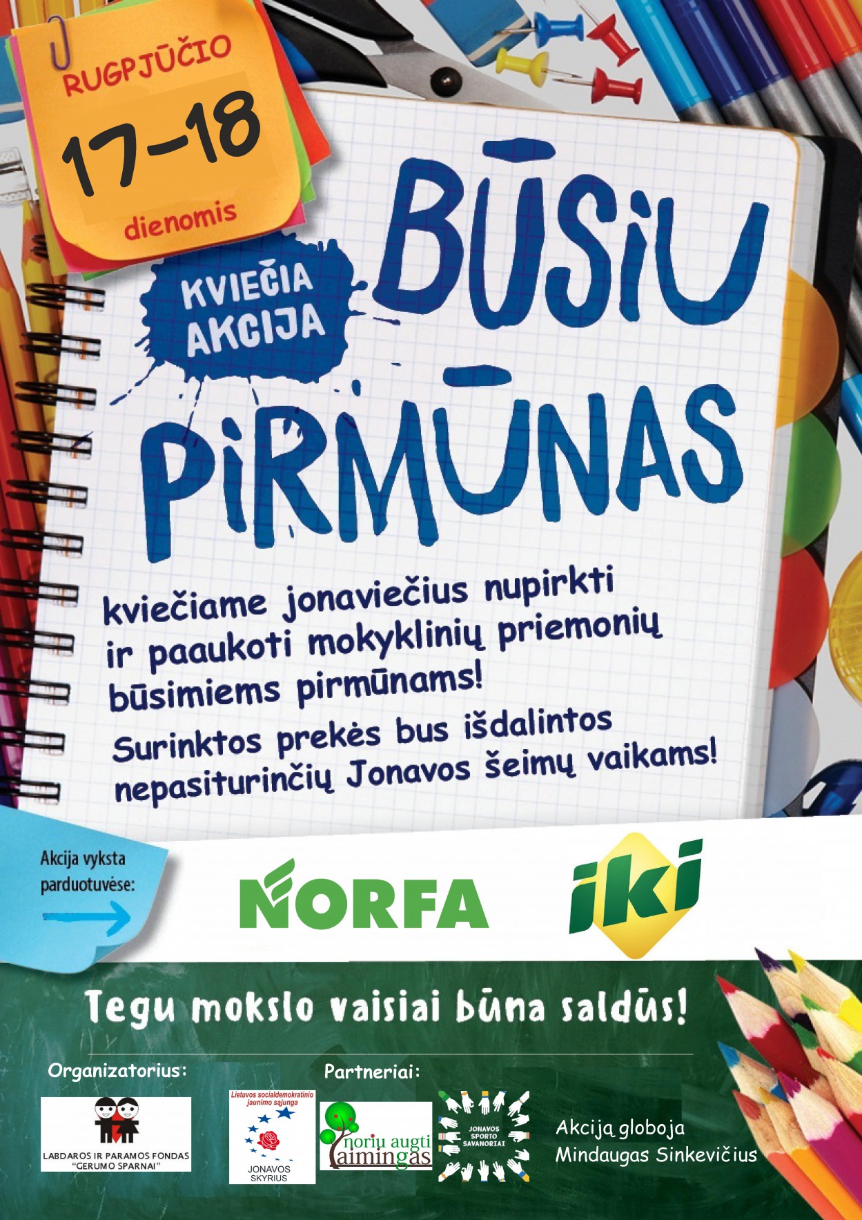 Šį savaitgalį Jonavoje esančiuose prekybos „Iki“ ir „Norfa“ vyks socialinė akcija „Būsiu pirmūnas“, kurios tikslas – pakviesti prekybos centrų lankytojus nupirkti ir paaukoti mokyklinių prekių vaikams iš nepasiturinčių šeimų.
