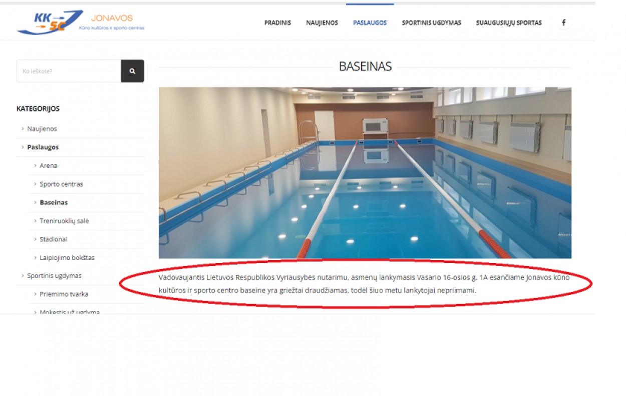 Po nuotrauka buvo užrašas: „ Vadovaujantis Lietuvos respublikos vyriausybės nutarimu, asmenų lankymasis Vasario 16-osios g. 1A esančiame baseine yra griežtai draudžiamas, todėl šiuo metu lankytojai nepriimami.“