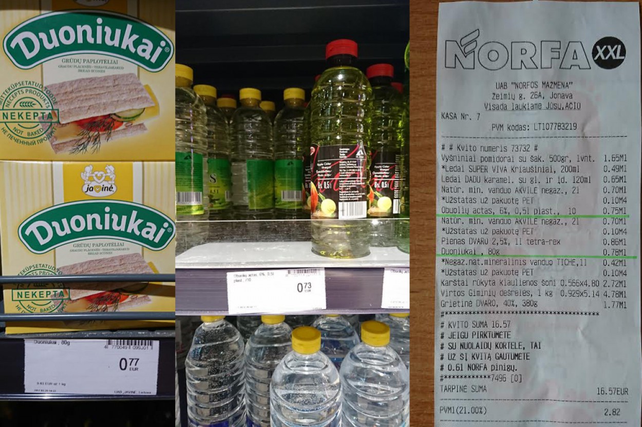Obuolių acto kaina lentynoje nurodyta 0,73 Eur, o kasos čekyje - 0,75 Eur, „Duoniukų“ kaina lentynoje - 0,77 Eur, o kasos čekyje - 0,78 Eur.