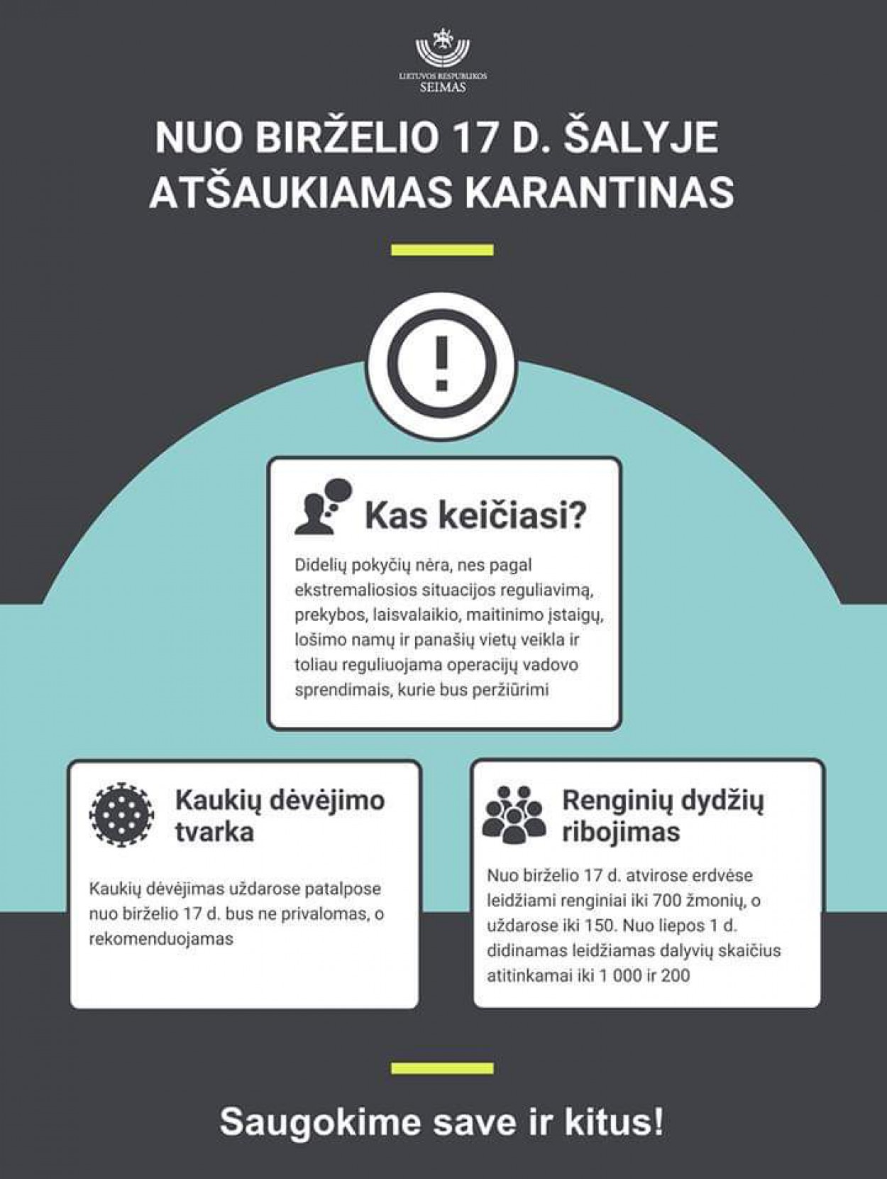 Karantino rėžimas galioja iki birželio 16 d. 24 val. Nuo birželio 17 d. įsigalioja valstybės lygio ekstremaliosios situacijos režimas. Dauguma ribojimų ir reikalavimų tampa rekomendacijomis.