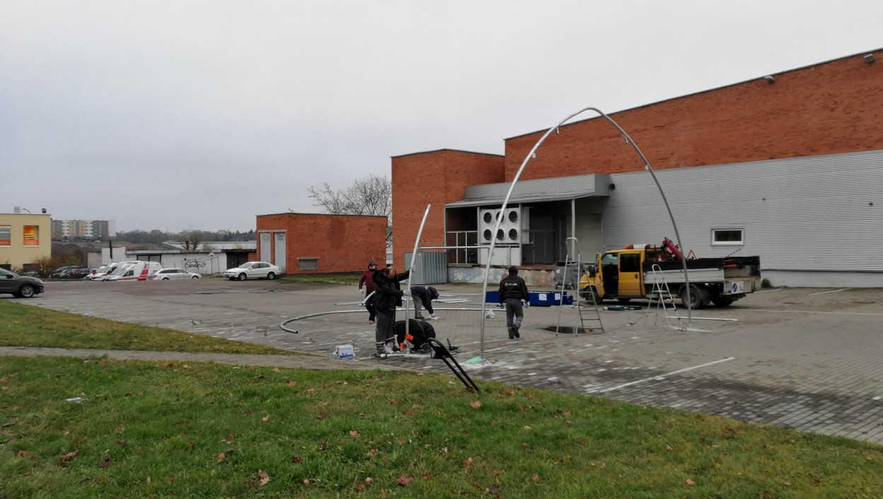 Laikinas statinys „dygsta“ automobilių stovėjimo aikštelėje, šalia buvusios „Norfa“ parduotuvės, Žeimių g. 21A.