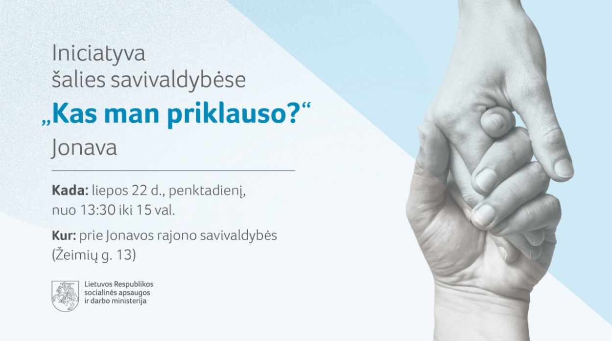 Liepos 22 d., penktadienį, nuo 13:30 val. iki 15 val. Jonavoje Socialinės apsaugos ir darbo ministerijos atstovai konsultuos žmones socialinės paramos, užimtumo, pensijų, socialinio draudimo, žmonių su negalia socialinės integracijos ir kitais klausimais.