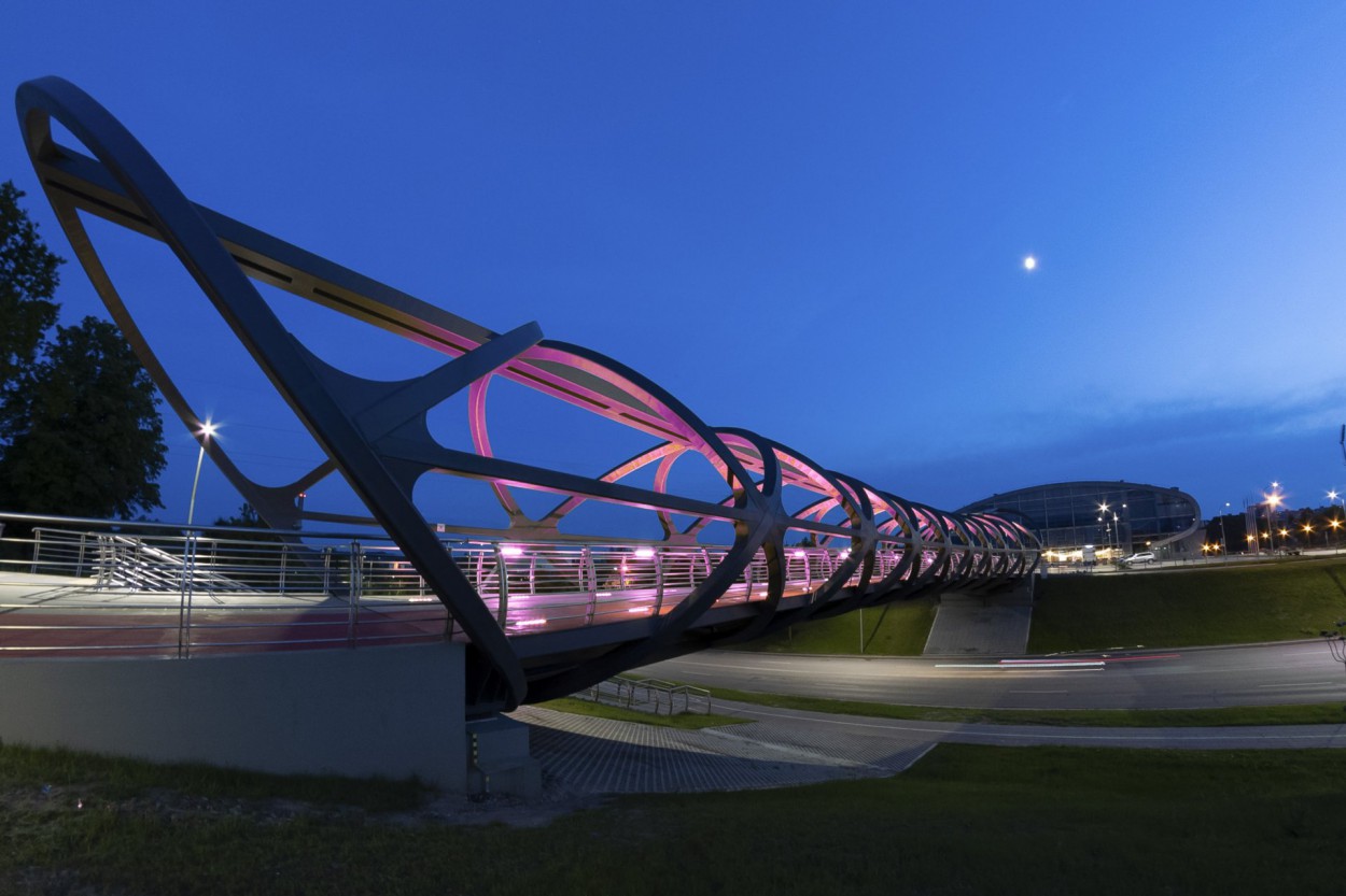 Minint Pasaulinę Alzheimerio ligos dieną trečiadienio vakarą purpurine spalva nušvito Jonavos pėsčiųjų tiltas, Šviesos bokštas, bibliotekos pastatas.