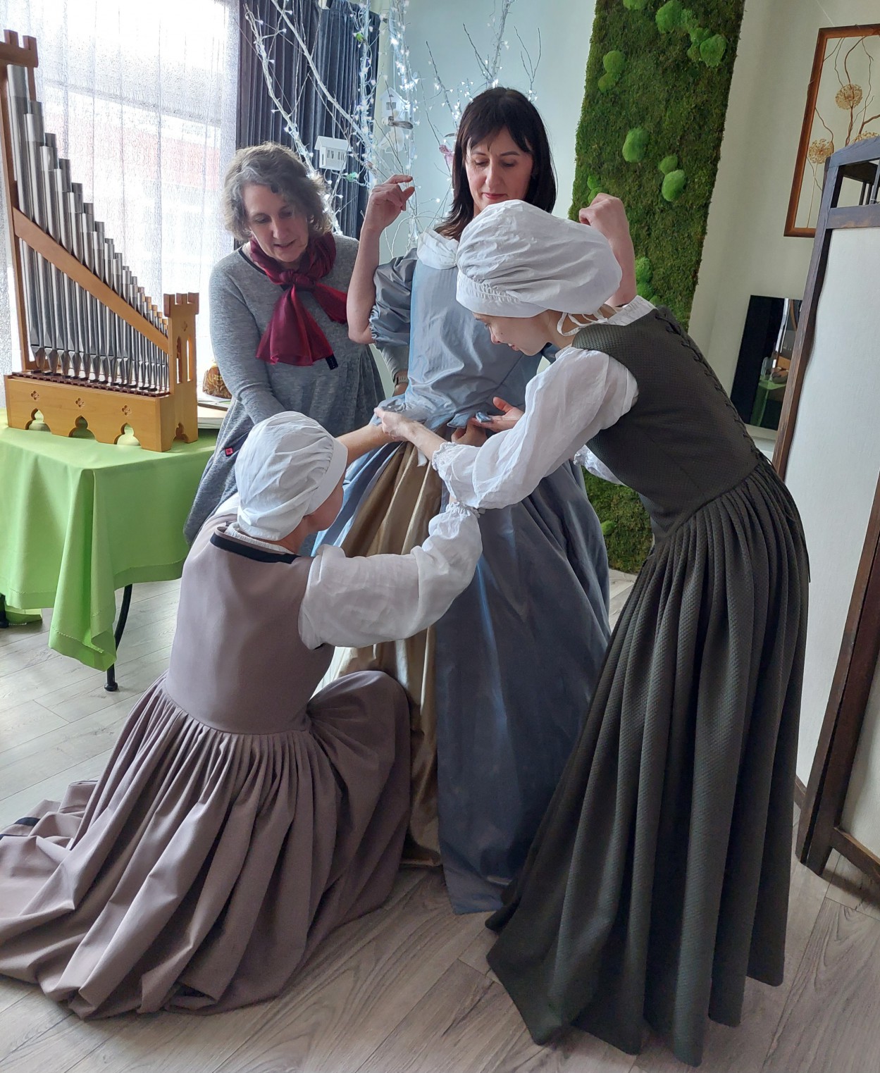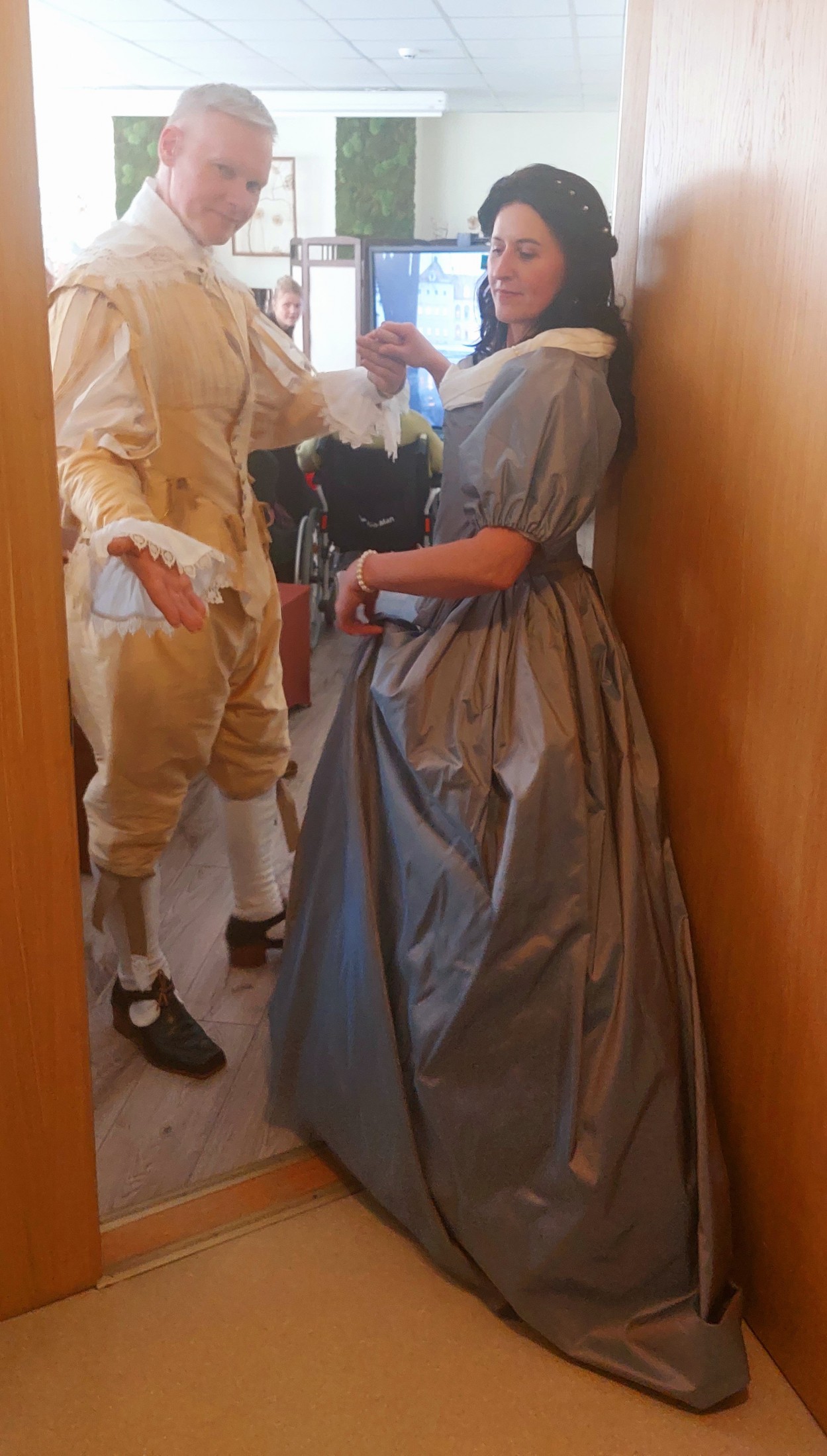 Biržų Radvilų tvirtovėje dirbantys krašto muziejaus darbuotojai jonaviečiams pristatė rekonstruotus XVII a. pradžios vyrišką ir moterišką kostiumus. Tokiais drabužiais rengėsi kunigaikštytė Liudvika Karolina Radvilaitė ir Jonušas Radvila jaunystėje po studijų Leipcige. Kostiumai autentiškai atkurti istorinių rūbų rekonstruktorės Eglės Kukytės, medžiagos tikrų tikriausiai atkeliavusios iš už jūrų marių. Netikėtai paaiškėjo, kad Globos namų kolektyvo tarpe yra ir panelė Radvilaitė, ir ponaitis Radvila – darbuotojai mielai sutiko pabūti modeliais ir puikiai įsijautė į vaidmenį: tiek veiksmais, tiek manieromis. Moteriškas ir vyriškas kostiumas nuotaikingai pristatyti nuo pradžių pradžios: nuo apatinių iki karolių, šukuosenų ir puošnių rankogalių.