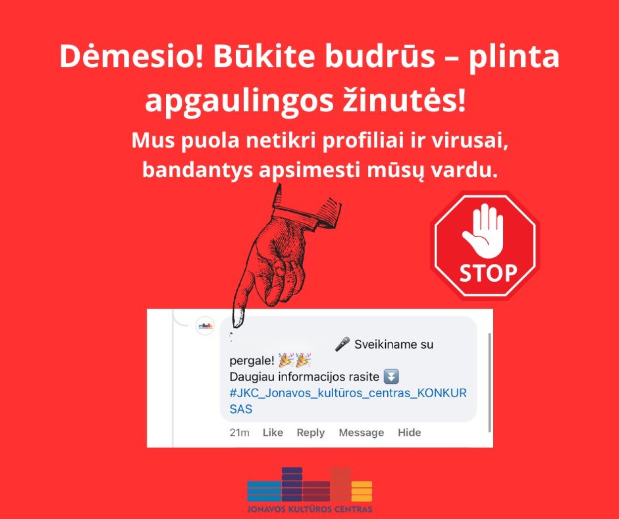 „Mus puola netikri profiliai ir virusai, bandantys apsimesti mūsų vardu“, – rašoma kultūros centro pranešime. Įstaiga primena, kad visus konkursų nugalėtojus visuomet skelbia tik oficialioje Jonavos kultūros centro „Facebook“ paskyroje, o su laimėtojais susisiekiama tik asmeniškai – privačia žinute iš tikro profilio: JKC Jonavos kultūros centras.