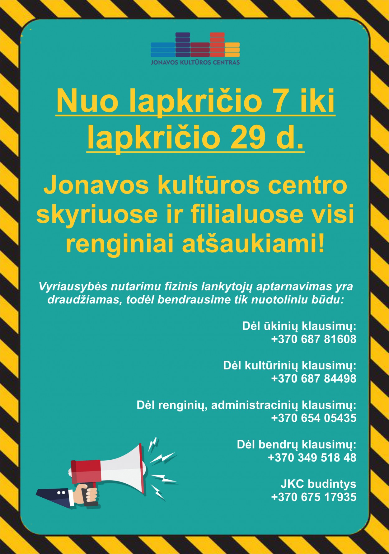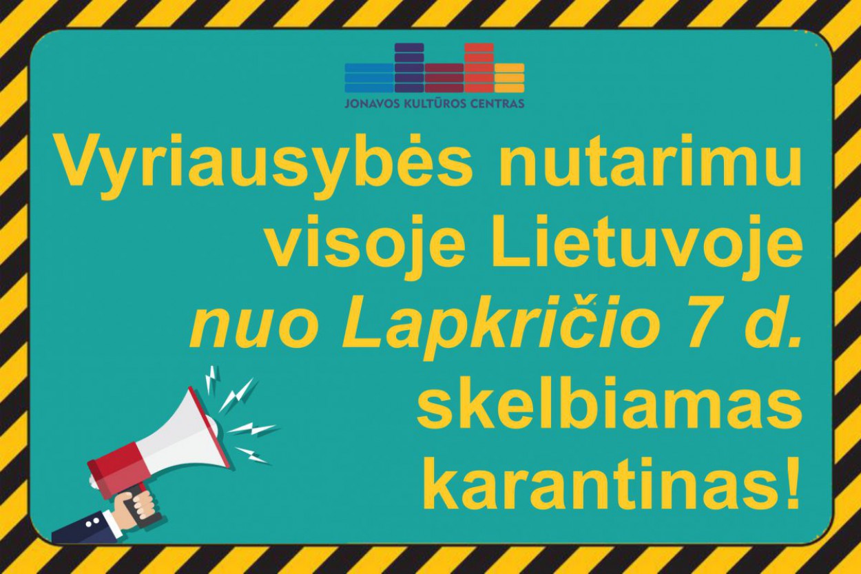 Informuojame, kad nuo lapkričio 7 iki lapkričio 29 d. Jonavos kultūros centro skyriuose ir filialuose visi renginiai atšaukiami!