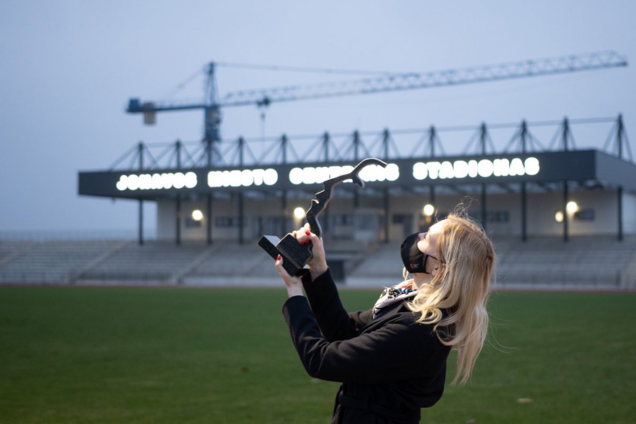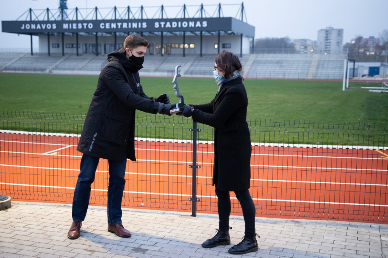 Skulptoriaus Kęstučio Musteikio specialiai apdovanojimams sukurtą granito statulėlę Jonavos rajono merui įteikė Švietimo, mokslo ir sporto ministerijos Sporto grupės vyriausioji specialistė Dalia Galnaitytė.